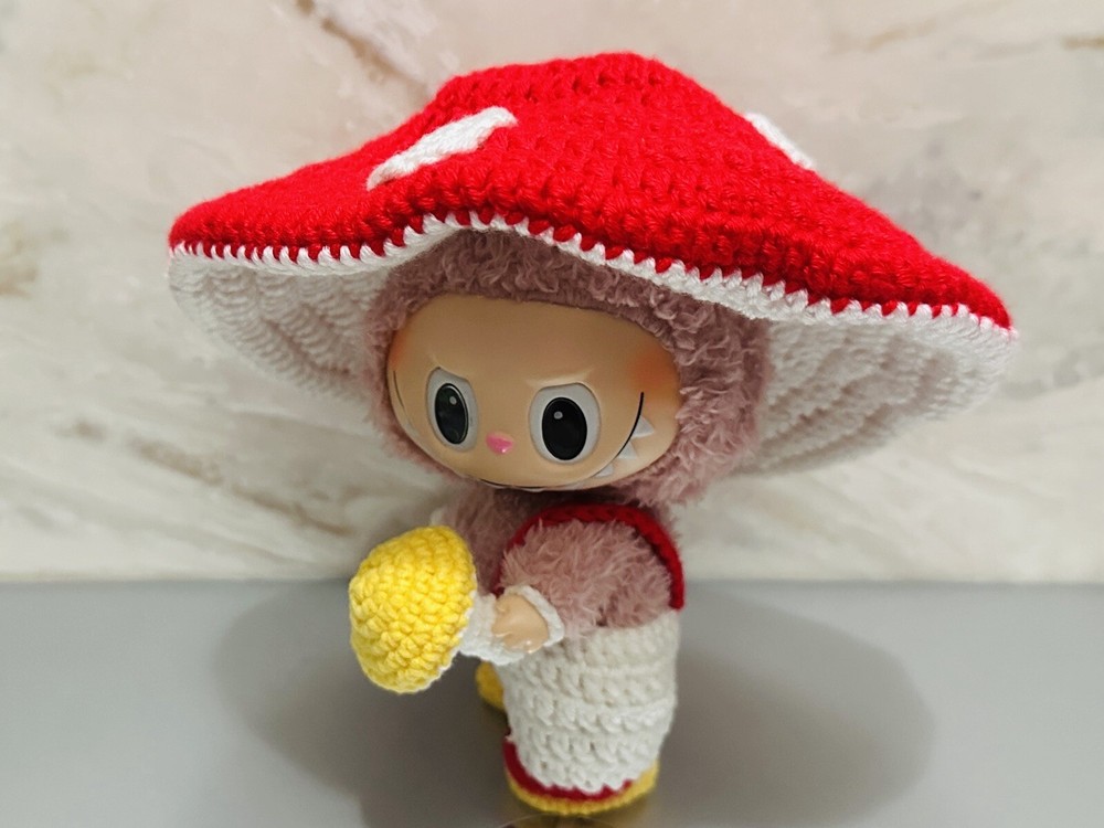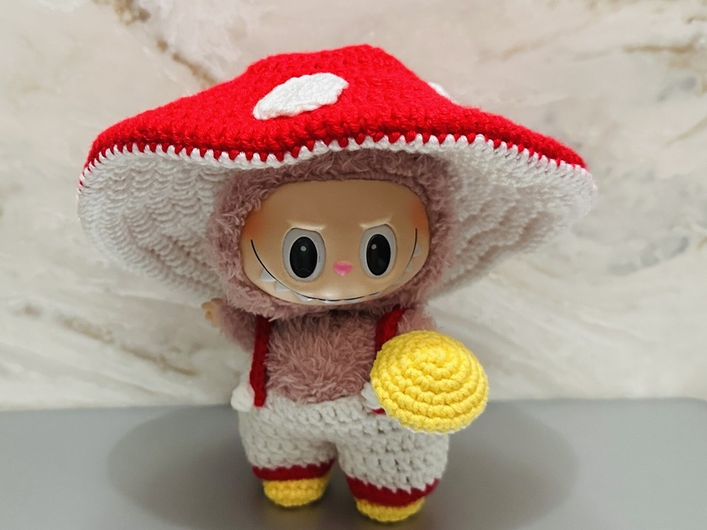 The product is a 17cm miniature action figure made from cloth material, specifically in the shape of a mushroom (labubu clothes). This handmade item would be a unique addition to any doll collection, providing a whimsical and playful touch with its quirky design. Perfect for doll enthusiasts or collectors looking to add a one-of-a-kind piece to their collection.