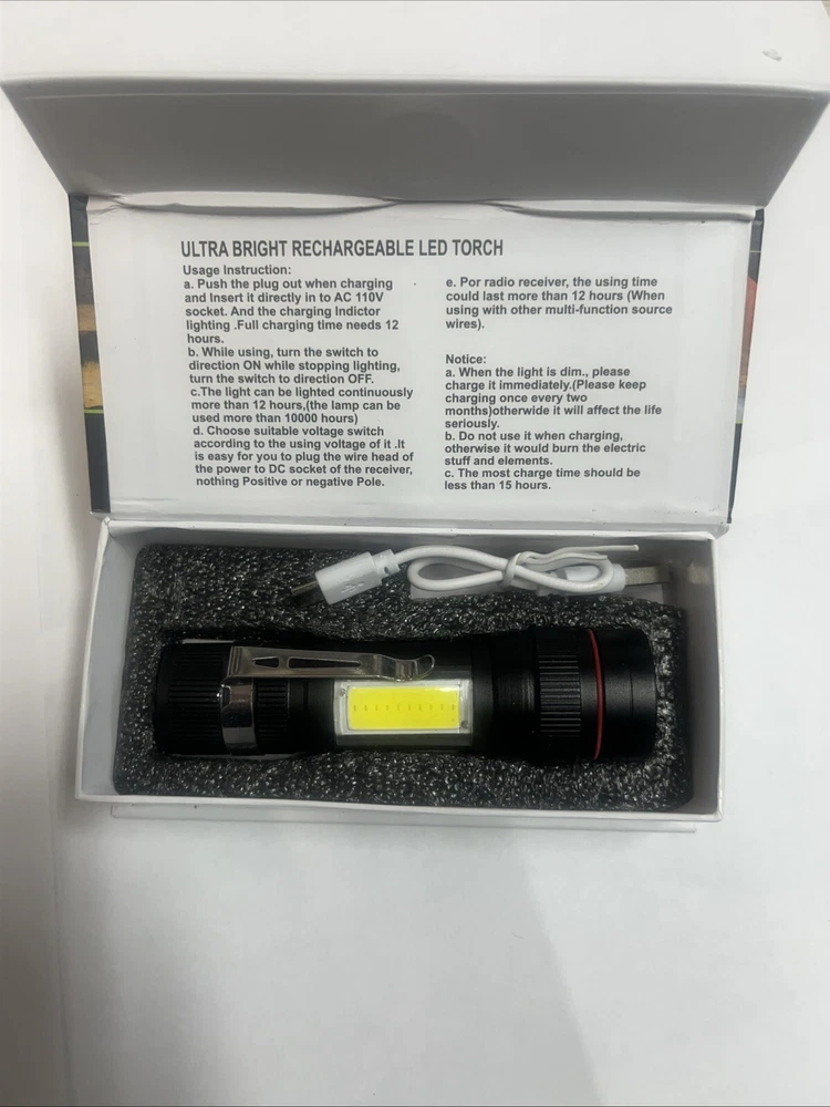 The product is an LED flashlight that is rechargeable through a USB power source. It is designed to provide a bright and energy-efficient light source, perfect for outdoor activities such as camping and hiking. The rechargeable feature allows for convenient and eco-friendly use, eliminating the need for disposable batteries. With its compact and portable design, this flashlight is a practical and reliable tool to have on hand for various outdoor adventures.