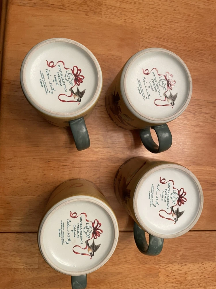 Set of four (4) Lenox Winter Greetings Everyday mugs - three cardinals and one chickadee