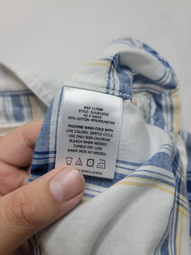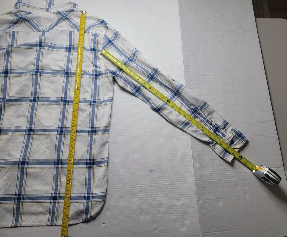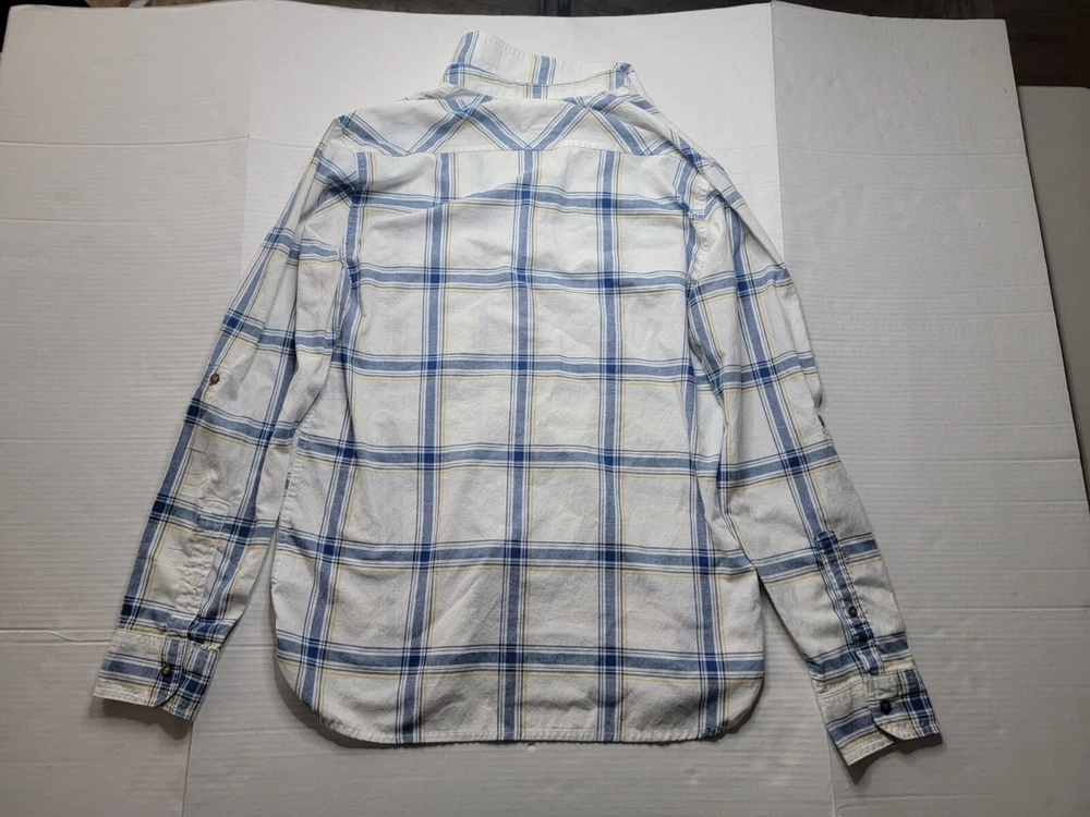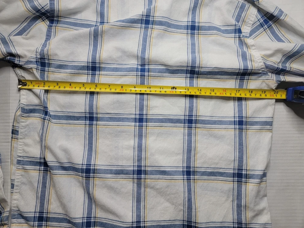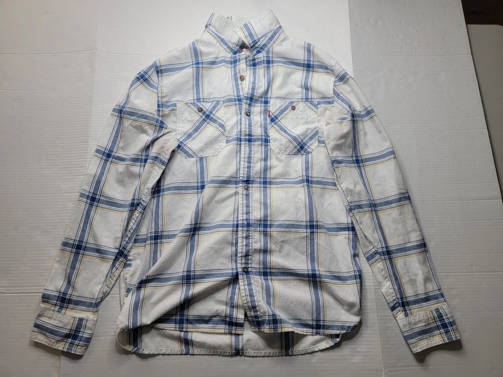 This is a Levi's casual button-up dress shirt for men with a plaid pattern in blue and white. It has long sleeves, a button-down collar, and is suitable for casual occasions. The shirt is in size M.