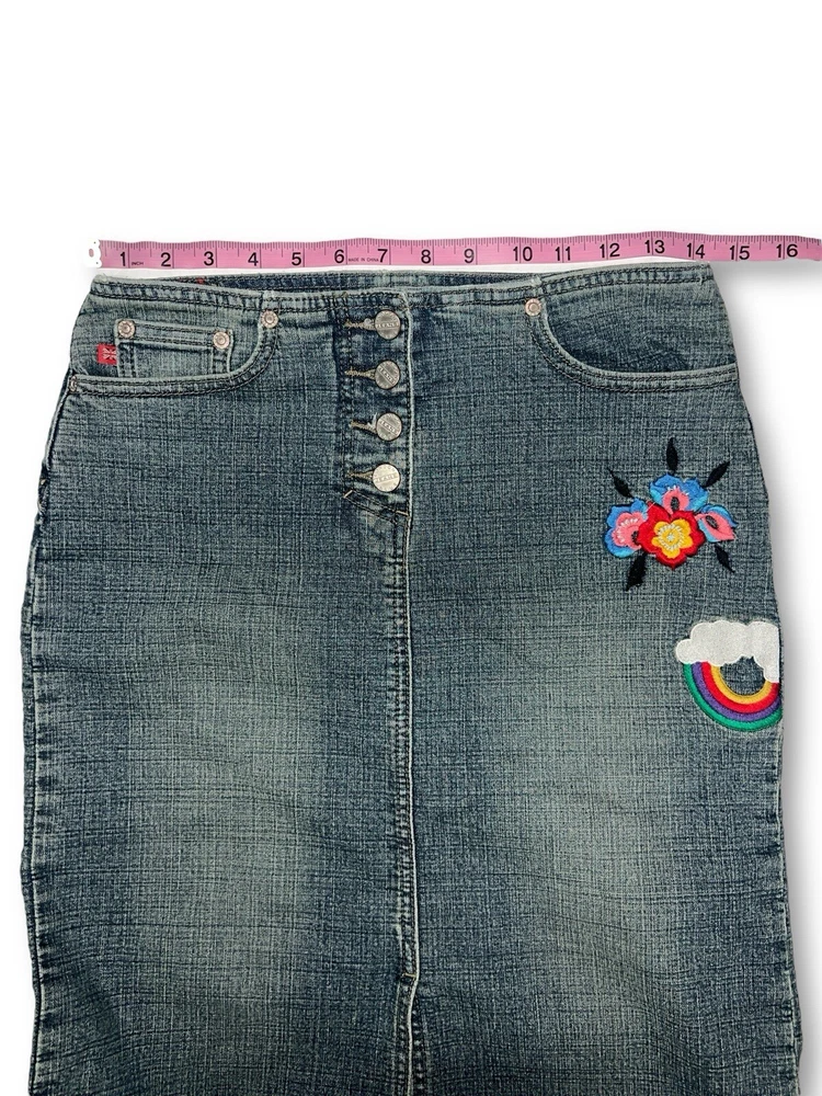 Vintage Y2K funky embroidered jean skirt by London Blue Vigoss Jeans. Four button buttonfly closure. Rainbow and flower embroidery on the left side and additional flowers on the back near waist. Two front pockets and no belt loops. Tag says size M (see measurements) 70% cotton and has some stretch to it.