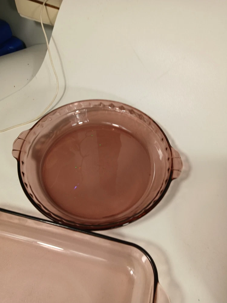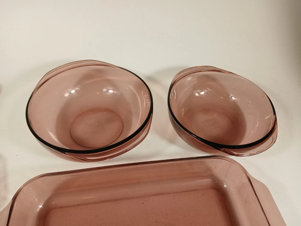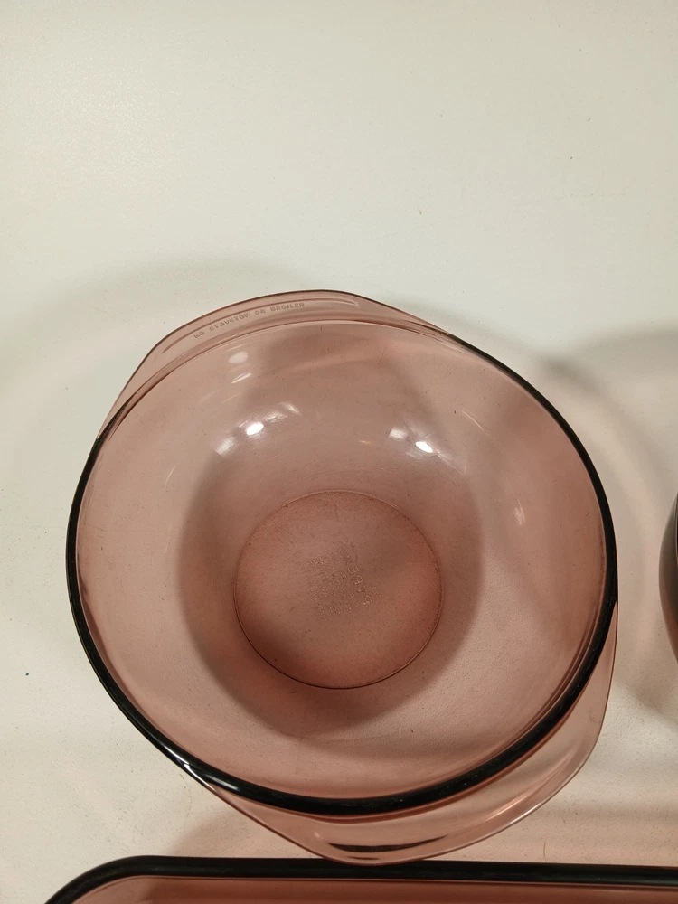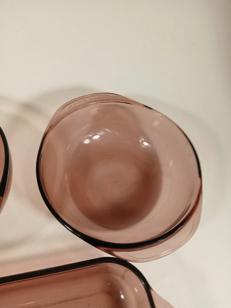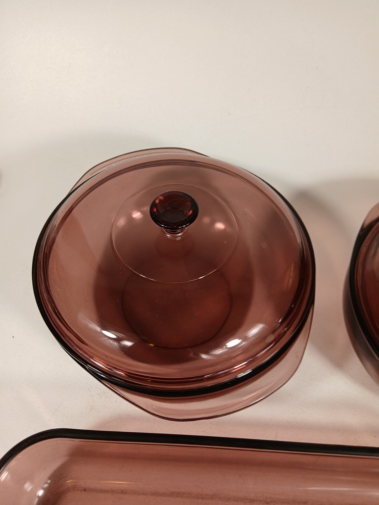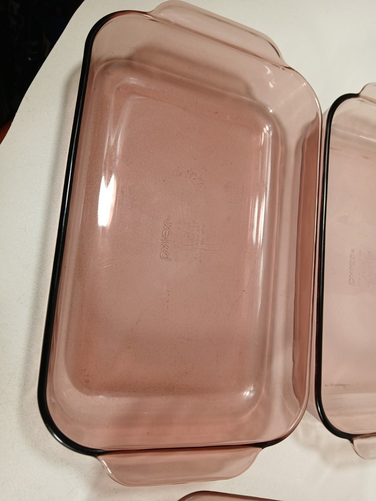 024 - 2l - heavy scratches and wear, few knicks - 624c lid - a few light scratches and knicks 023 - 1.5L - light scratches and wear, few knicks - 623c lid - a few light scratches and knicks pie dish - 229 - 23cm - light scratches and wear, few knicks 232-r - 2qt - 2l casserole pan - light scratches and wear, few knicks 232-r - 2qt - 2l casserole pan - this is a little lighter shade than other pans - light scratches and wear, few knicks 233-r - 3 qt - 3l -casserole pan - heavy scratches and wear, few knicks