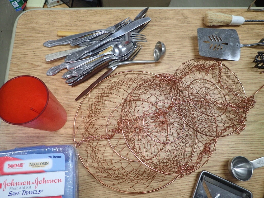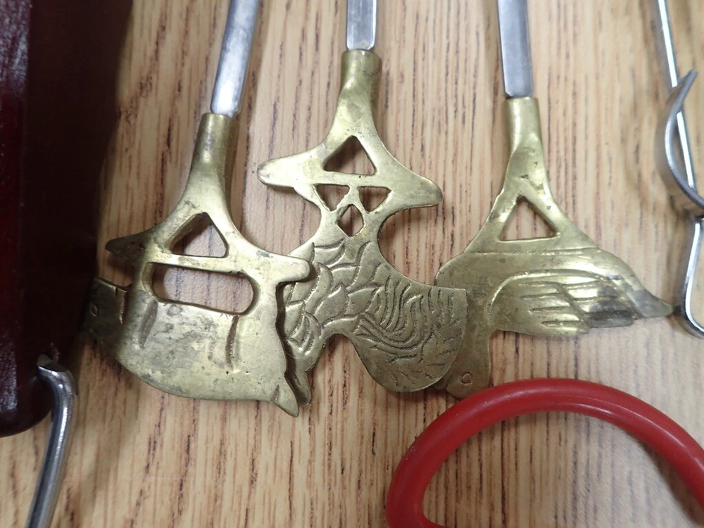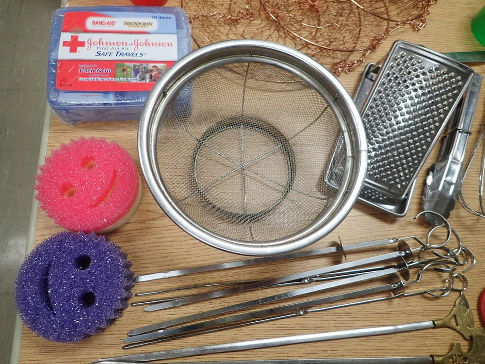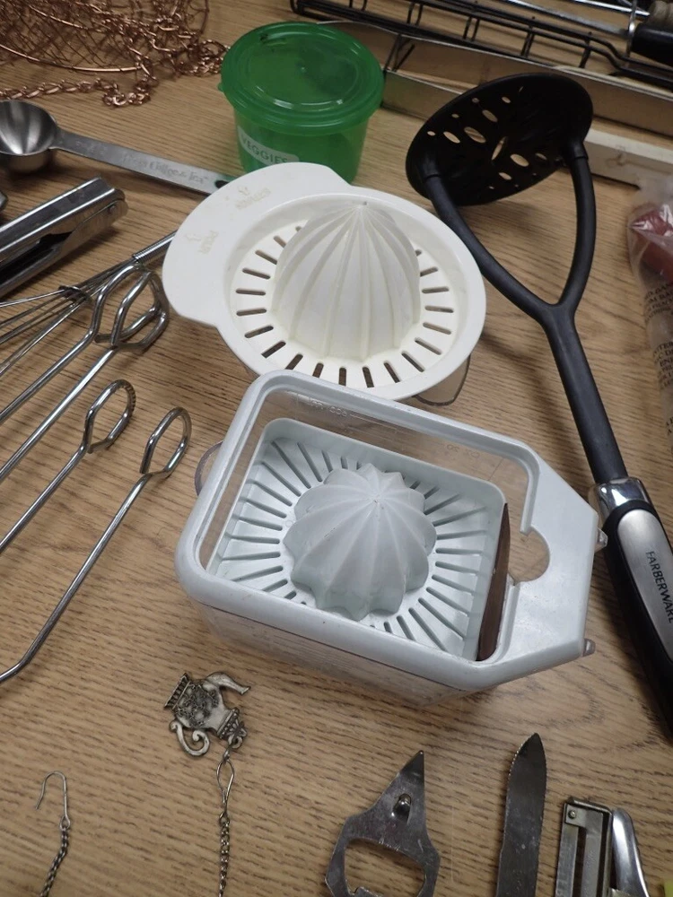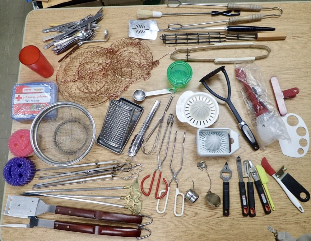 ITEM DESCRIPTION: A lot of vintage kitchen accessories and tools. ADDITIONAL INFORMATION: A variety of odds and ends silverware, a metal 3-tier hanging basket in a copper color, small Henckels tools, plastic gadgets, an assortment of grill tools and skewers, an unopened first aid kit, and much more. CONDITION: Very good, m Inor wear, as found. AGE: Unknown. COUNTRY OF ORIGIN: USA and foreign. LOTS: Due to logistic reasons we don’t break up lots. SHIPPING: We only use USPS, UPS, and FedEx. All items are safely packaged but they do still break on occasion. We buy insurance for fragile and/or valuable items. Street address required for FedEx and UPS deliveries. Bulky or very heavy items are listed for local pick-up only. INTERNATIONAL SALES: This item is available to international buyers only through the eBay Global Shipping program.