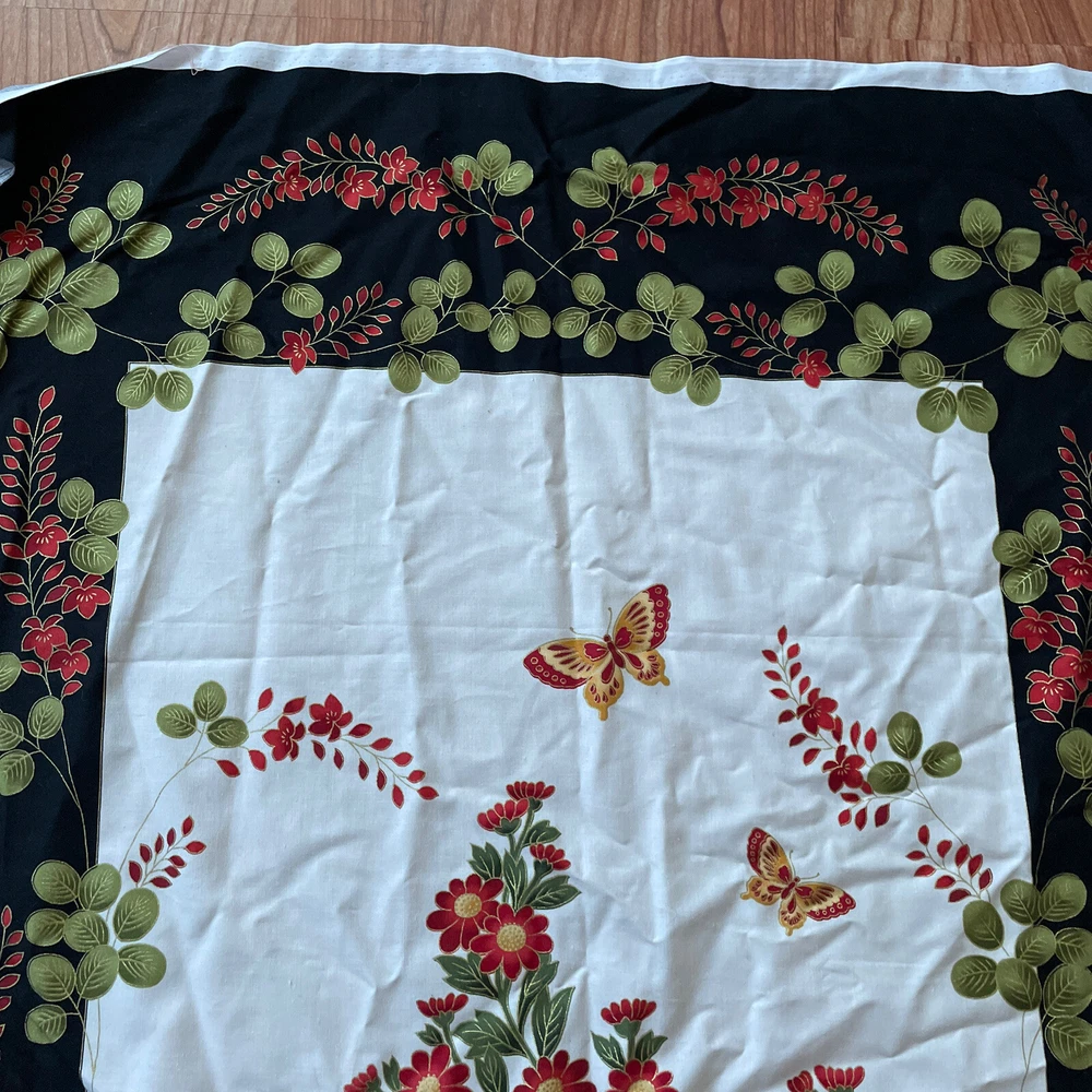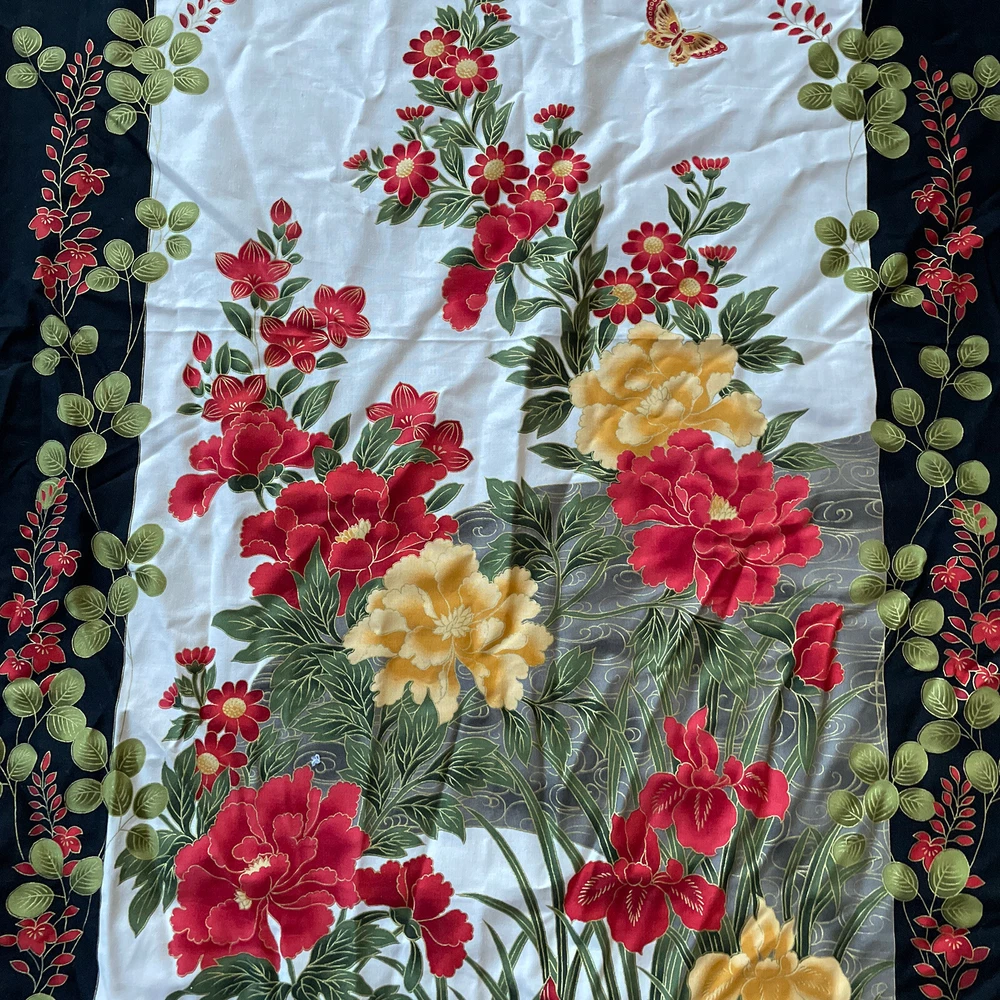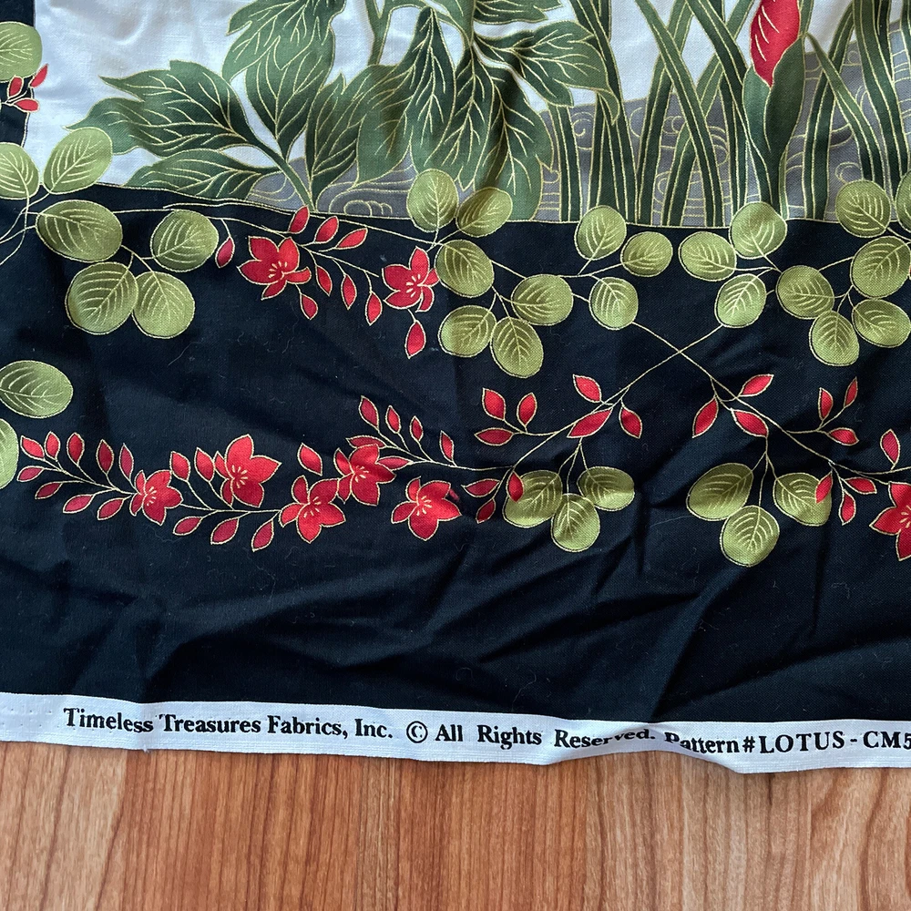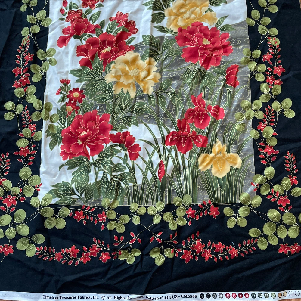 lotus red yellow floral fabric Panel timeless treasures. Has gold metallic accents. Measures about 23.5”x43”