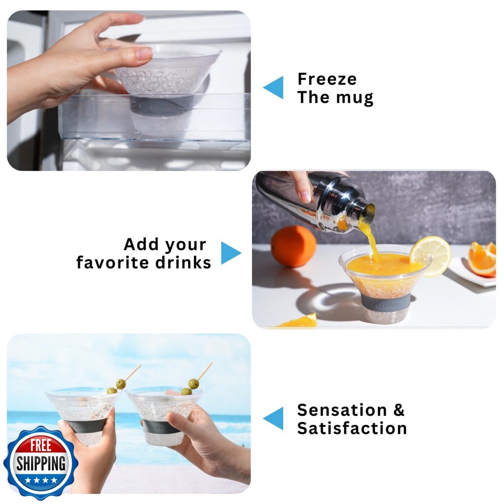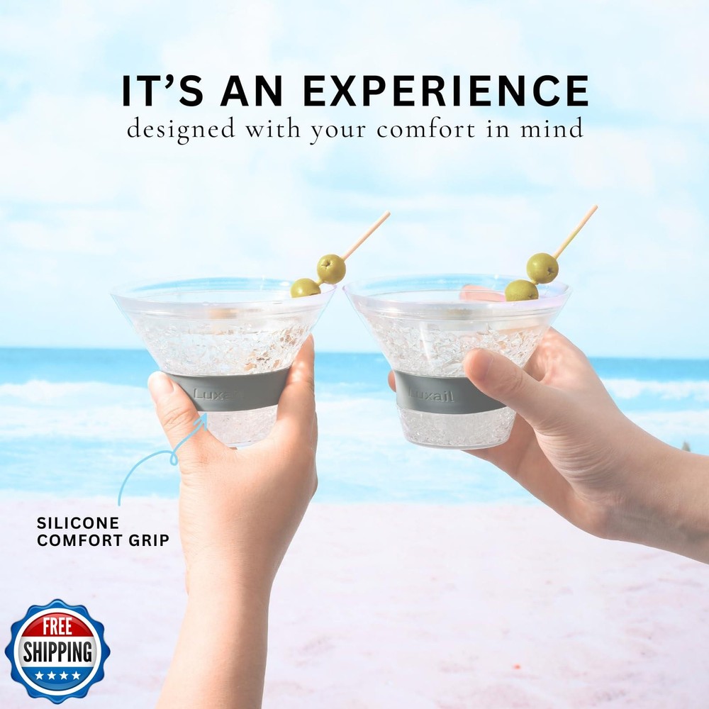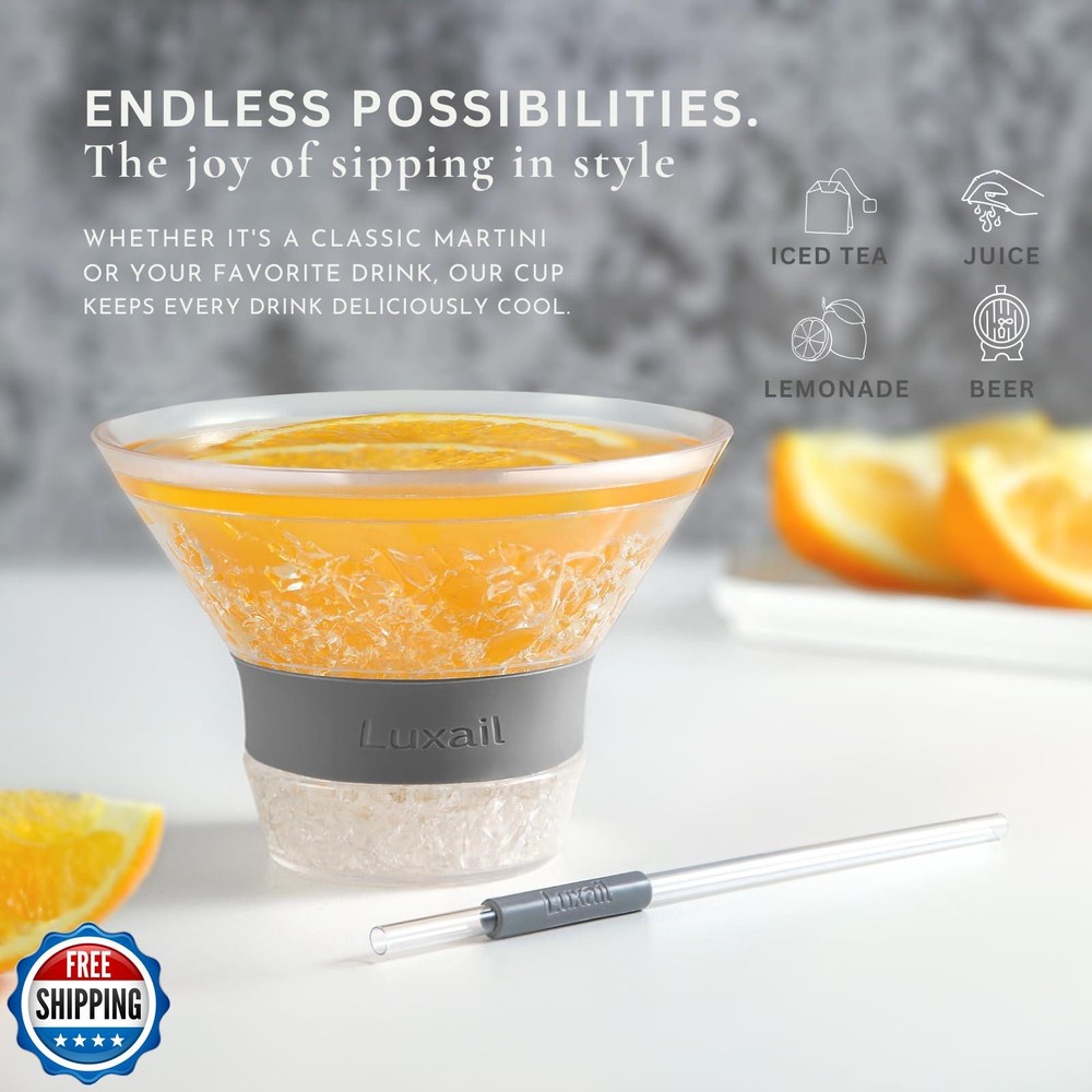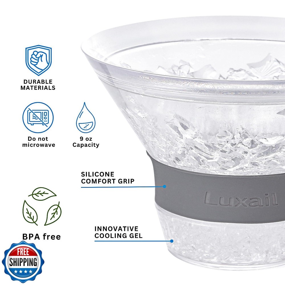 luxail Martini Glasses, Plastic Martini Glasses Set of 2, Double Wall Stemless Martini Cups, 9 Oz Capacity, Martini Gifts, Grey, 2 Reusable Cocktail Straws Features ELEVATE YOUR MARTINI EXPERIENCE WITH A CHILLED TOUCH - Designed for optimal enjoyment, the Luxail Martini Freeze cocktail glasses are meticulously crafted to maintain the coolness of your cocktails for up to 2 hours, whether you prefer them shaken or stirred. Say farewell to ice and dilution concerns. 2 Straws Included THE MAGIC IS IN THE GEL - The insulated plastic walls of these stemless martini cocktail glasses are filled with proprietary cooling gel. This works as a beverage chiller when frozen. Freeze for two hours and keep your drinks chilled for longer. EASY SIPPING WITH COMFORT-GRIP SILICONE BAND - Crafted from BPA-free plastic, these sturdy martini glasses are versatile for any setting. The addition of an insulated silicone band at the base ensures a cozy grip, ideal for outdoor enjoyment! hand wash only THE PERFECT GLASS FOR A WIDE RANGE OF CLASSIC COCKTAILS - All kinds of classic cocktail recipes stay frosty in the Luxail Martini Freeze. Enjoy a manhattan, cosmopolitan, or classic gin or vodka martini without watering down your quality ingredients. UNIQUE GIFT FOR THE SEASONED COCKTAIL CONNOISSEUR- This set of martini glasses makes an exceptional gift for your father or any cocktail enthusiast seeking the ultimate sipping satisfaction. A fantastic addition to your camping essentials! Shipping Free & Fast Shipping: We offer free shipping to most of the USA with a normal delivery time of 3-7 days. However, due to the current situation, additional delivery time (up to 3 weeks) may be required for some items. Alternative Carriers: We may use alternative carriers (e.g., USPS, FedEx, UPS) to ensure your package arrives safely and on time. Due to the use of multiple carriers, we are unable to provide a tracking number automatically. Handling Time: Orders are processed and shipped within 1-2 business days of receiving cleared payment. Shipping Restrictions: Shipping to Alaska, Hawaii, Puerto Rico, Guam, and other US territories may incur shipping charges or delivery restrictions. Please contact us before ordering, or your order can be refunded/cancelled. State Restrictions: Certain items may not be shipped to California due to state regulations. Contact for Tracking Updates: If you require tracking updates or have any concerns about the delivery of your order, please feel free to contact us, and we will be happy to assist you. Return Policy 30-Day Hassle-Free Returns: If you are not completely satisfied with your purchase, you can return the item for free within 30 days of receiving it for a full refund or exchange. Easy Return Process: Contact us, and we will provide you with a prepaid return shipping label and detailed instructions. No Restocking Fee: There are no restocking fees for returns. However, the buyer is responsible for return shipping costs if the return is not due to a seller"s error. Refund Processing: Refunds will be processed within 1 business day of receiving the returned item in its original condition. Feedback Your feedback is extremely important to us. We strive to provide the best products and customer service possible. If you are satisfied with your purchase, please take a moment to leave us a positive review. If you have any concerns or issues with your order, please contact us before leaving negative feedback. We are committed to resolving any problems and ensuring your satisfaction. Contact Us If you have any questions or concerns, please feel free to reach out to our customer support team. You can contact us through the eBay messaging system. We are available Monday to Friday, 9:00 am to 5:00 pm EST, and we will do our best to respond to your inquiry within 24 hours. Thank you for supporting our small family business!