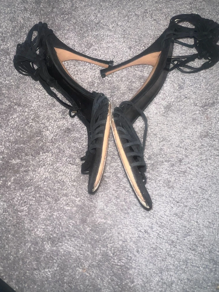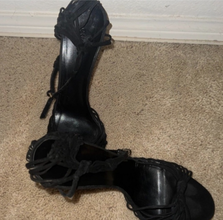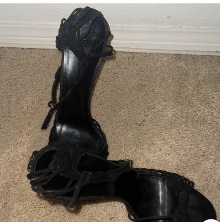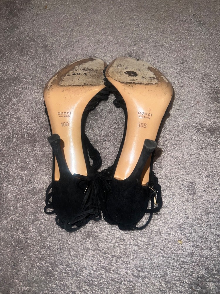 These are Gucci women's heels in size 10.5. They feature a black suede material with a strappy design and a peep toe style. Made in Italy, these sophisticated heels are perfect for adding a touch of luxury to any outfit.gently loved condition no damage or wear marks