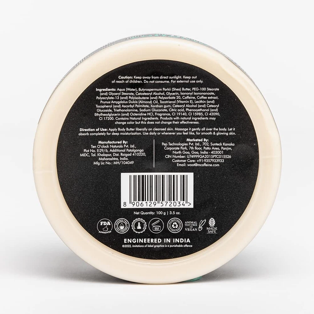 Ingredients: Coffee Extract, Caffeine, Shea Butter, Almond Oil Directions: Apply the body butter liberally on cleansed skin. Massage it gently all over the body and let it absorb for deeper moisturization. Use it everyday or whenever you miss your smoother and glowing ski Product Description