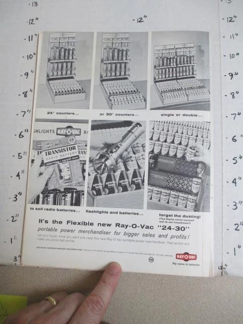 ITEM DESCRIPTION magazine ad 1964 RAY-O-VAC battery flashlight store display transistor radio $25.00 I have listed 1000s of mostly color and some B&W magazine and newspaper ads from the 1920s to 1960s. Most are extremely colorful with great graphics. Click HERE to see all my newspaper ads currently listed on EBAY. Comes from a rare retail industry trade publication. NOTE--this listing is for ONE ad only (the top one that's visible). I took EBAY pics with all ads in a stack to save me time. CONDITION ----fine to excellent, paper is thin , cheap magazine grade Additional condition comments (if needed) : SIZE is indicated by the ruler or INCH markings in the photo. AD ON REVERSE ? Occasionally an ad will have another DIFFERENT ad on the back or reverse side. If not indicated in the title, the pictures will make it obvious. OFFERS ---I list 20,000+ items a month on EBAY. It is easier to put Best Offer on everything but because I lose 15% to EBAY fees no matter what, I may not be willing to take offers on everything I have listed. COMBINED SHIPPING ? YES...I can do this but ONLY If you follow the below instructions. To be clear, "combined shipping" is when you buy 3 items, for example, each with a shipping charge of $8, but since I can ship all 3 in the same box, you get charged $10-12 instead of $24. I cannot "combine shipping" after you have already paid. 1) DO NOT USE the cel phone app ! If you do, EBAY will force immediate payment and charge you full shipping on each item. I will not refund your money if this happens. 2) You must log into EBAY with a browser (Chrome, Safari etc) on your phone, computer or laptop to avoid this. 3) Put all items in your Cart and then, while in your Cart, click the "Request Total" link. "Request Total" will not be visible if you click "Checkout" under your Cart icon. You must click "View Cart" under your Cart icon. The URL should say cart.ebay.com Because EBAY and PAYPAL have made partial refunds so complicated, I will no longer be refunding $ if you do not follow these instructions. MY PHOTOS - If more than 1 item is shown in a photo--- then items are in SEPARATE listings unless otherwise stated ! Read description! PAYMENT-General Info PAYMENTS- USA Various payment options will show during checkout. Contact me if you need another payment option. EBAY is charging sales tax. Sellers have no control over that. PAYMENT-FOREIGN ORDERS Various payment options will show during checkout. Contact me if you need another payment option. SHIPPING COST ? .... see "SHIPPING COSTS : Shipping-Foreign" (shown below). CUSTOMS CHARGES -- your country may charge you customs fees before you can receive the package. This is not my responsibility NOR is it part of my shipping charge. It is a fee charged by the country you live in. SHIPPING COSTS SHIPPING-USA FIXED SHIPPING RATE = actual shipping cost & insurance & small handling fee ($2 or less). West Coast may be significantly higher on larger or heavier items. FYI here is what the US Post Office currently charges : SHIPPING-FOREIGN For UK, Canada,and Australia , PLEASE check with me first to make sure shipping charges EBAY has listed are correct! In the last few years, there have been HUGE increases in shipping cost outside the USA. The shipping cost listed is usually for FIRST CLASS shipping. The USPS will only insure Priority and Express shipments. ******There is a $2-$5 handling fee for foreign orders. ========================================================= Offered by DAVID WELCH ------ author of COLLECTING PEZ 1995 and Pictorial Guide to Plastic Candy Dispensers 1991. I have been a full time antique and collectibles dealer since 1989 and have been collecting since the early 1970s. I have been on EBAY since 1997. If you have questions about any negatives I have received, feel free to ask. THANK YOU TO THE PATIENT AND REALISTIC PEOPLE WHO MAKE 98% of EBAY DEALINGS A PLEASURE. I have been on EBAY since 1997 and this company's ability to make simple things needlessly difficult is unmatched by anything I have experienced elsewhere. ===================================================================== Powered by SixBit's eCommerce Solution