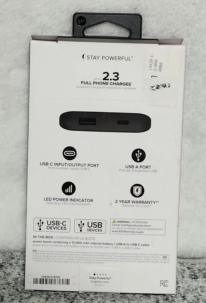 Introducing the Mophie Power Boost Portable Battery Charger, with a capacity of 10000mAh. This powerful charger comes with USB-A and USB-C inputs, allowing for fast charging of your Apple iPhone and Android USB-C devices. The charger is designed with a rugged finish, made from rigid plastic, and features LED lighting for added convenience. NEW With its wired/phone antenna port connectivity, this charger is perfect for those who are always on the go. It is compatible with a range of devices, including iPhones and Android USB-C models. The charger is made in China and comes with a range of features, including a durable design and a powerful charge.