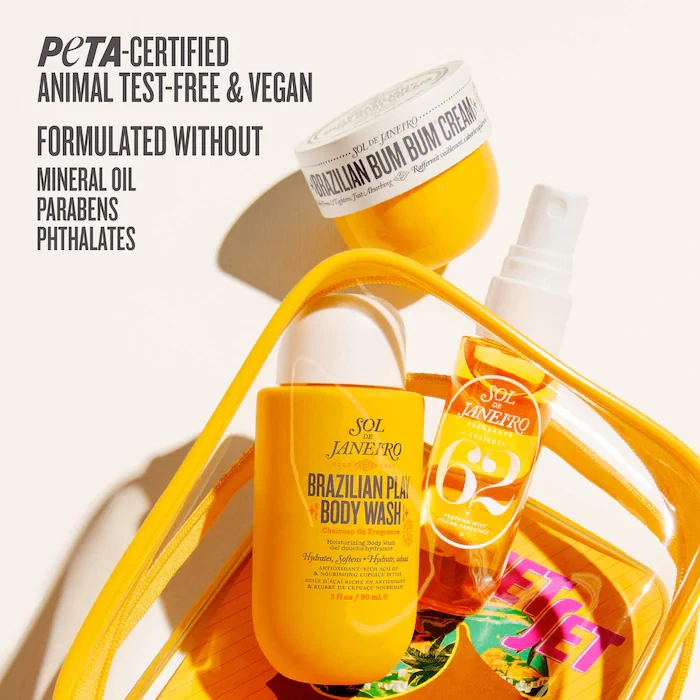 What it is: A travel-ready, body-loving collection set to fly with a trio of best-loved products in the cult-fave Brazilian Bum Bum Cream Cheirosa '62 scent. Highlighted Ingredients: - Guaraná: Contains caffeine to help support natural circulation, energy, and smooth skin. - Cupuaçu Butter: Contains fatty-acids, Phytosterols, and Polyphenols to lock in moisture and support a more elastic appearance. - Açaí Oil: Provides antioxidants which help protect skin’s youthful appearance. Ingredient Callouts: Free of sulfates SLS and SLES, parabens, formaldehydes, formaldehyde-releasing agents, phthalates, mineral oil, retinyl palmitate, oxybenzone, coal tar, hydroquinone, triclosan, and triclocarban. This product is also vegan, cruelty-free, gluten-free, and comes in recyclable packaging. What Else You Need to Know: These best-loved, travel-friendly minis include the iconic Brazilian Bum Bum Cream, Brazilian 4 Play Shower Cream-Gel, and Brazilian Crush Body Fragrance Mist for a head-to-toe fragrance blended with addictive notes of pistachio and salted caramel. This set helps keep you bodylicious, irresistible, and all set to fly. Bum Bum lovers know that layering this trio results in addictively soft-feeling skin and an even more irresistible fragrance. Experience the cult-fave scent from head-to-toe. LOVE IT. FLAUNT IT. YOU’VE GOT IT.™ This Set Contains: - 1.7 oz/ 50 mL Brazilian Bum Bum Cream - 3 oz/ 90 mL Brazilian 4 Play Shower Cream-Gel - 1.01 oz/ 30 mL Brazilian Crush Body Fragrance Mist