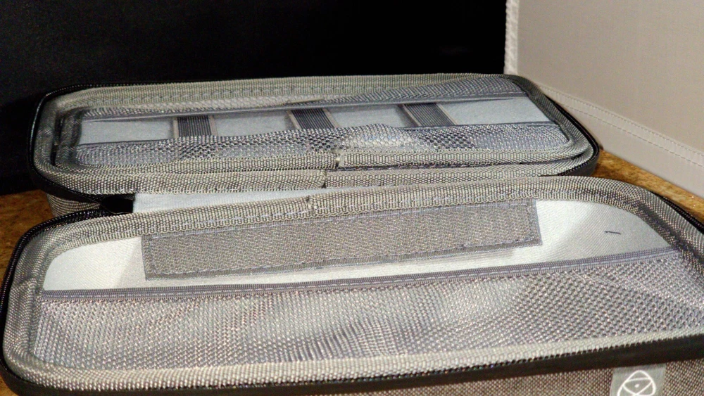 The Ninja Atomos V softshell case by Atomos is made of neoprene material and features an adjustable design. It is specifically designed to fit a Atomos display, providing protection and portability for the device.