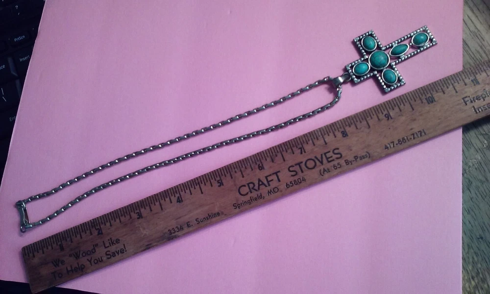 old Christian Silver-Tone CROSS & 18" Inch Chain Pendant Necklace & Blue Natural Stones Turquoise? The chain has neat unusual type links, not your normal chain.