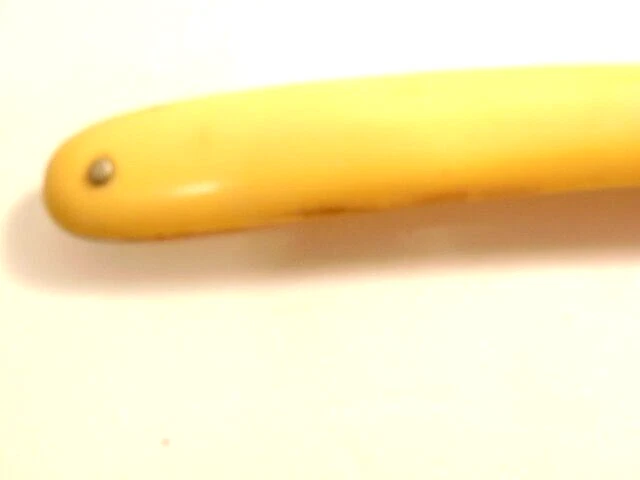 Here is a pre-owned old straight razor marked "Rattler" on the face of the blade and Germany near the rivet. The blade is also labeled "Welliver Hardware Co. Danville, PA". It measures about 6 inches long. The blade measures about 5 1/2 inches long and is about 5/8th inches wide. The razor shows some wear on the blade including staining and light corrosion on the blade and dirt on the yellow handle. Please see the pictures and ask any questions. Thank you for looking. (Inv 23,115)
