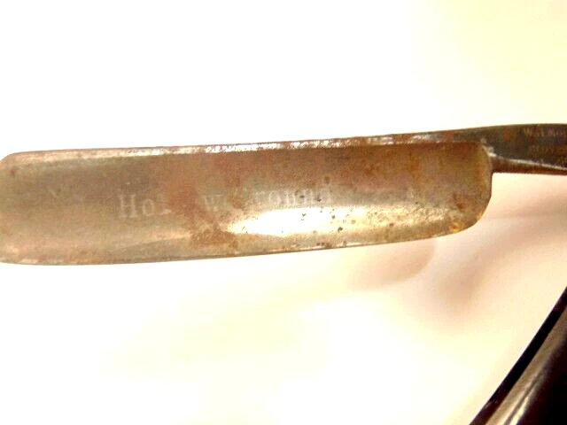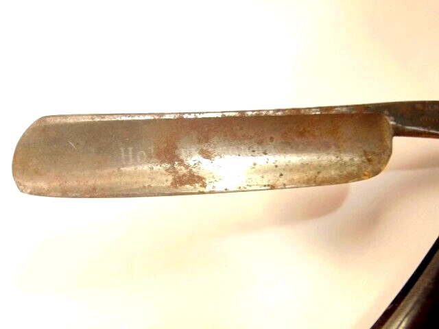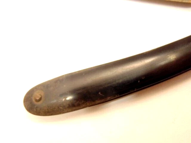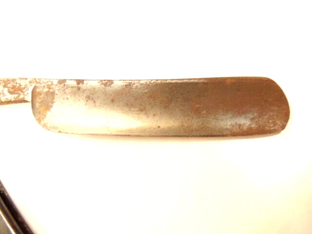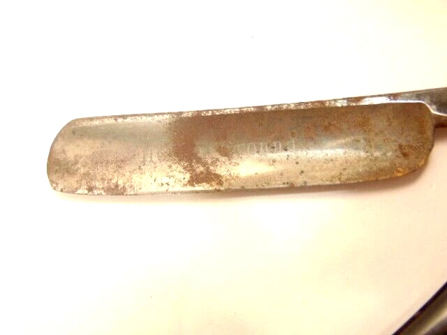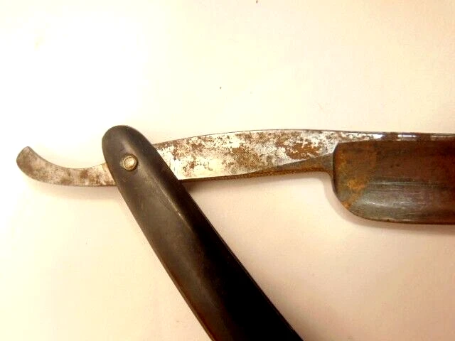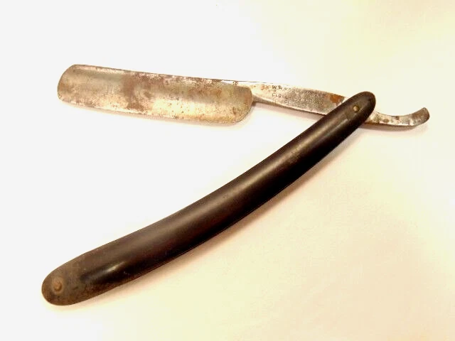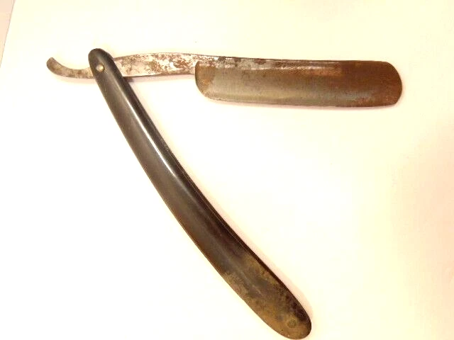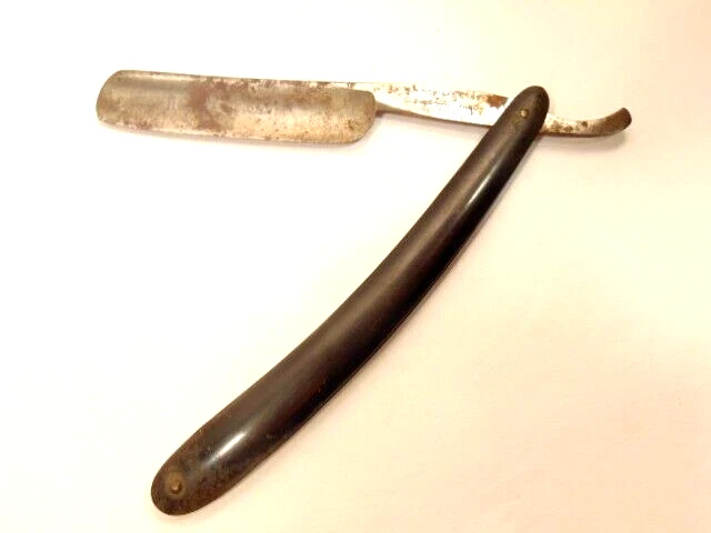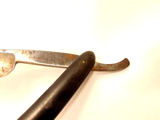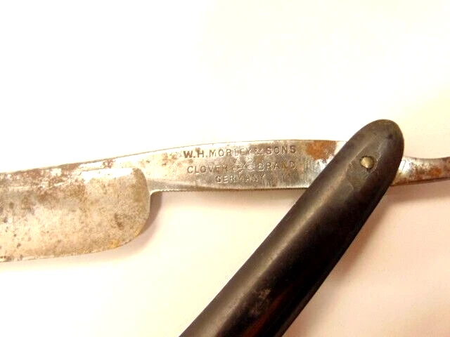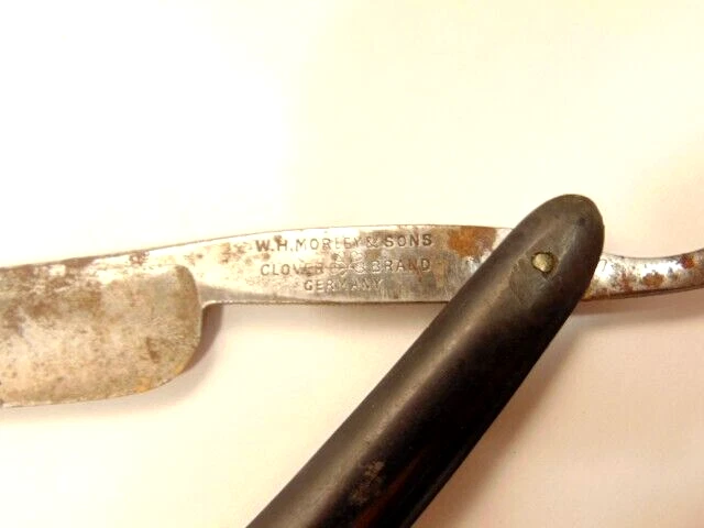 Here is a pre-owned old straight razor labeled W.H. Morley & Sons / Clover Brand, Germany. The razor has a black handle or scales. The blade centers well. The razor measures about 6 1/4 inches in length and the blade measures 5 5/8th inches from end to end. The blade is about 11/16 inches wide. The razor shows dirt and wear as well as corrosion on the blade. Please see pictures and ask any questions. Thank you for looking. (Inv 25,228)