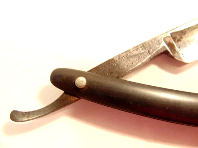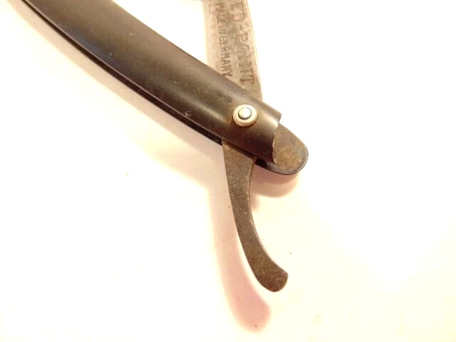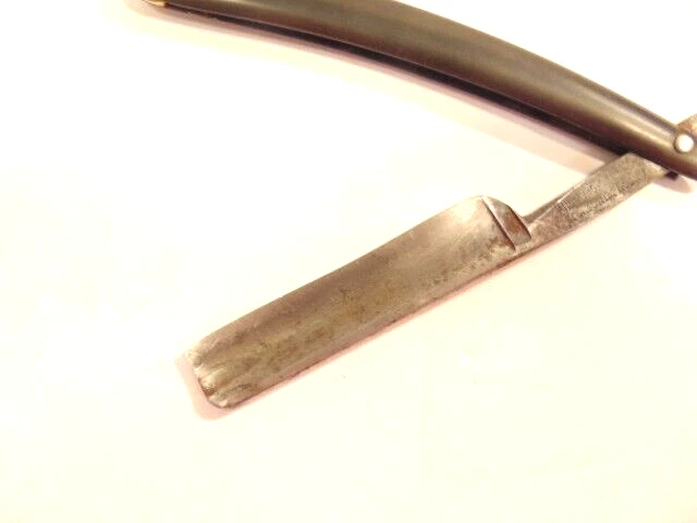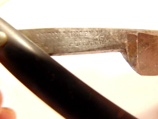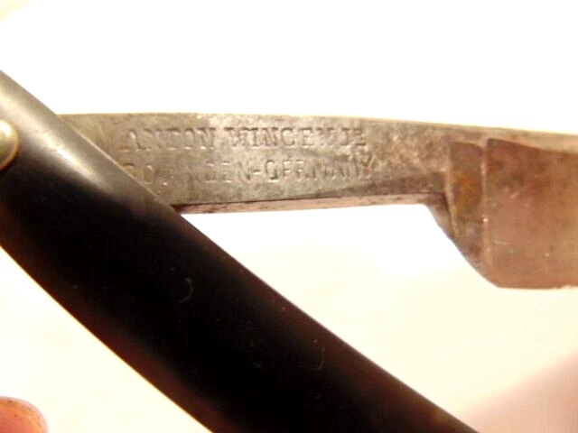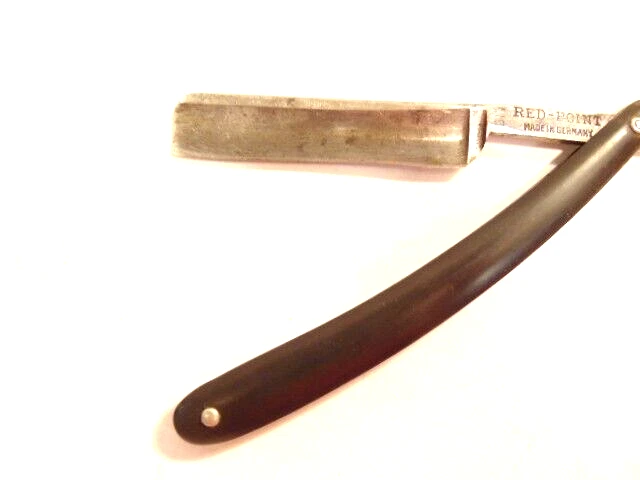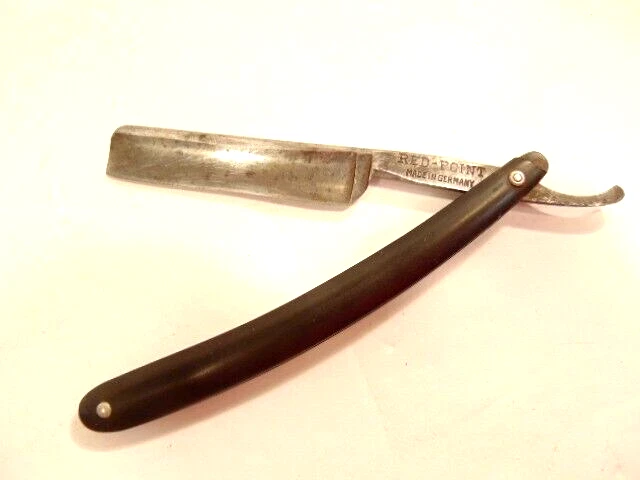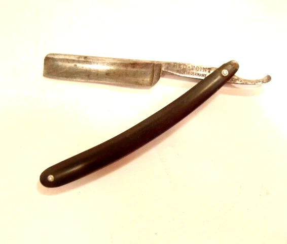 Here is an older straight razor marked "Red-Point" on one side, and Anton Wincen Jr,, Solingen, Germany onthe opposite side. The razor measures about 6 1/8th inches long. The blade measures about 5 1/2 inches long and is about 5/8th inches wide. It shows staining, dirt and wear. Please see the pictures and ask any questions. Thank you for looking. (Inv 22,972)