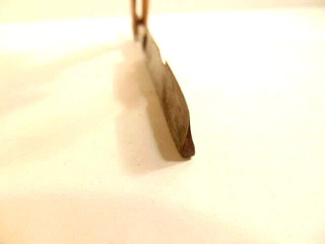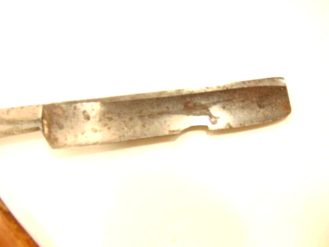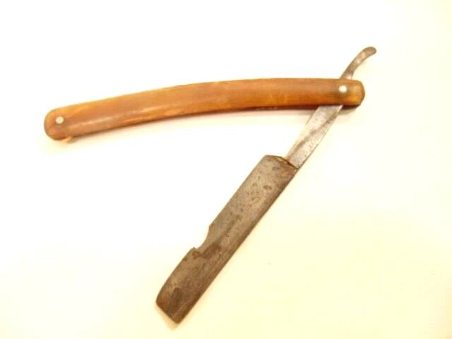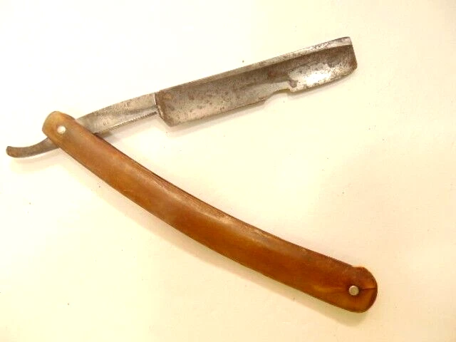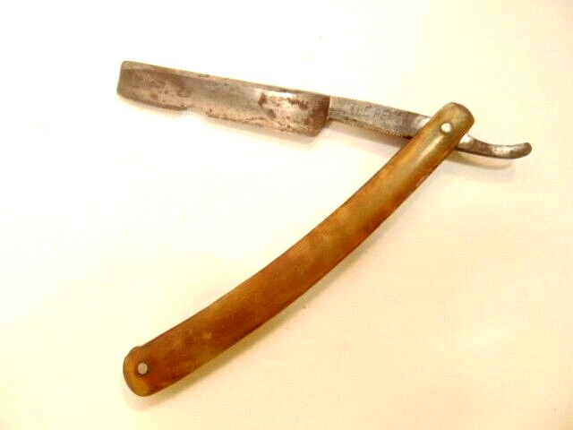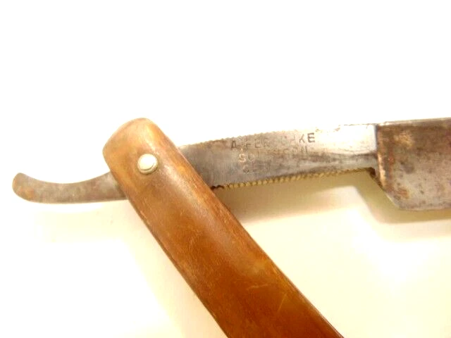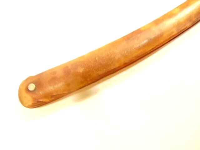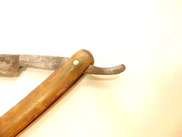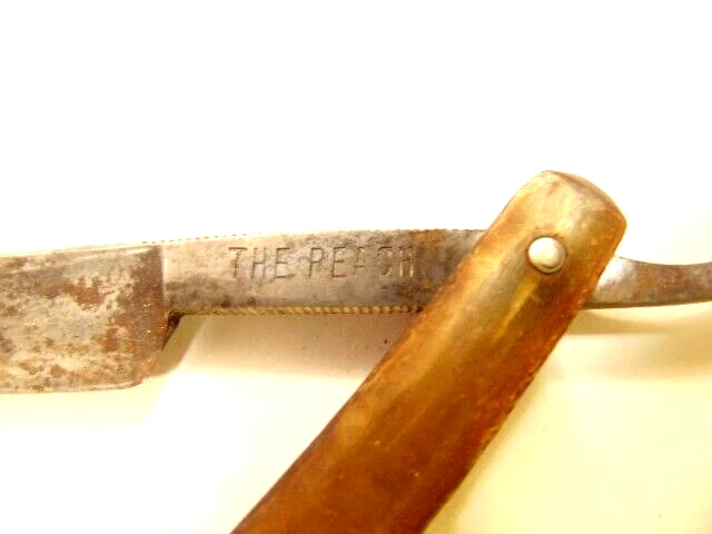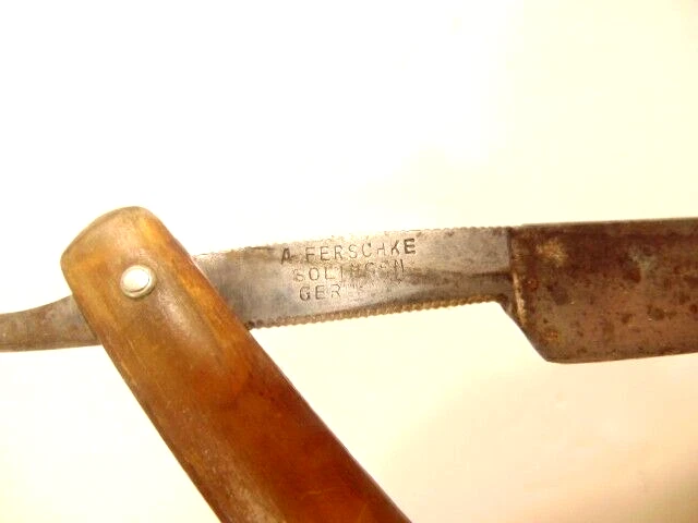 Here is a pre-owned older straight razor labeled "The Peach" on one side of the blade and "A. Ferschke, Solingen, Germany" on the opposite side. The razor has a brown handle or scales. The blade centers well. The razor measures about 6 inches in length and the blade measures 5 3/8th inches from end to end. The blade is about 9/16th inches wide. The razor shows wear and a crack on the handle. There is also some tarnish, dirt, wear and a chip on the blade. Please see pictures and ask any questions. Thank you for looking. (Inv 25,230)