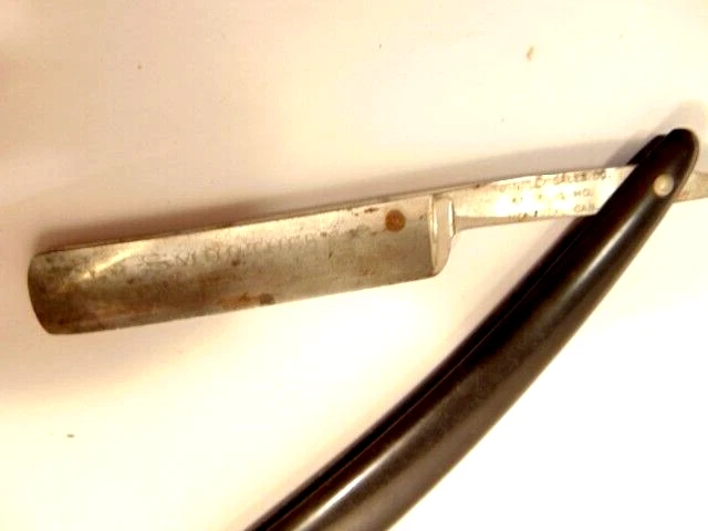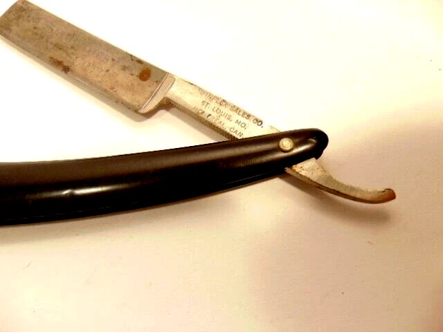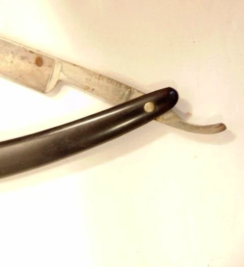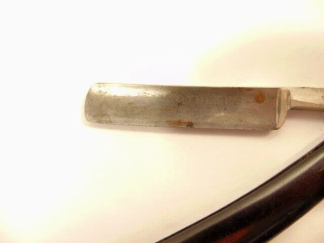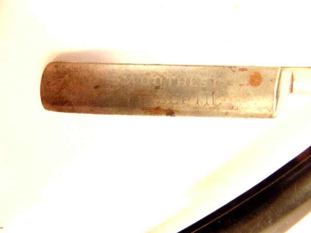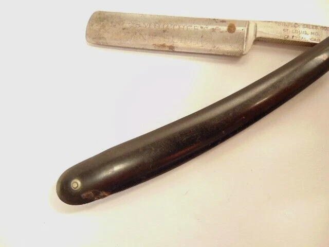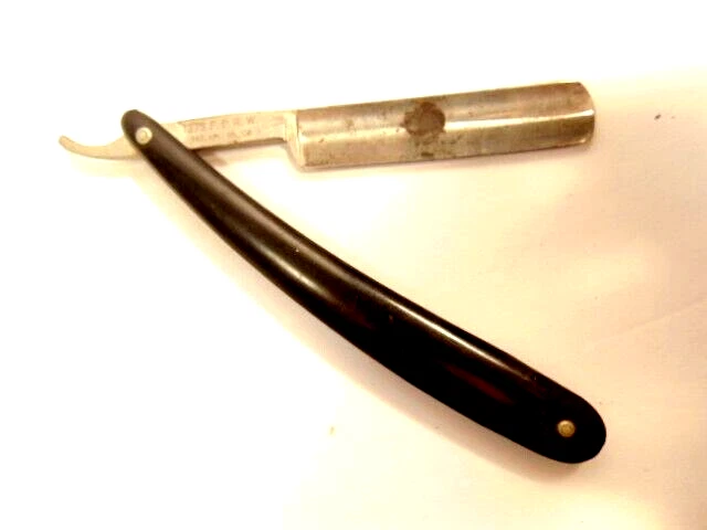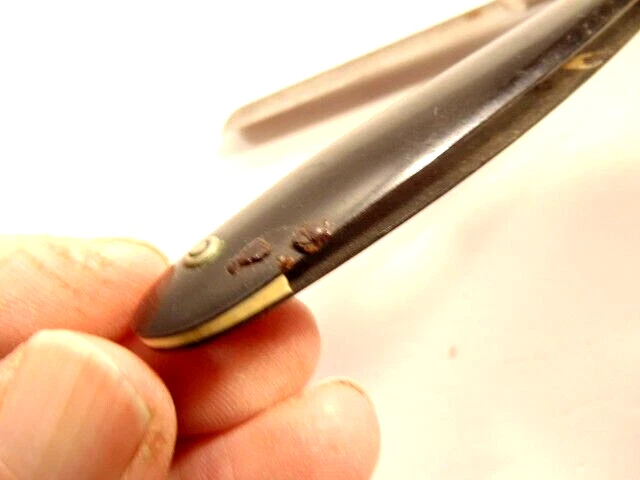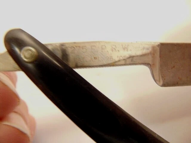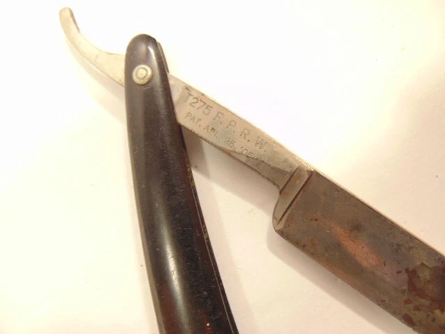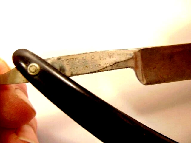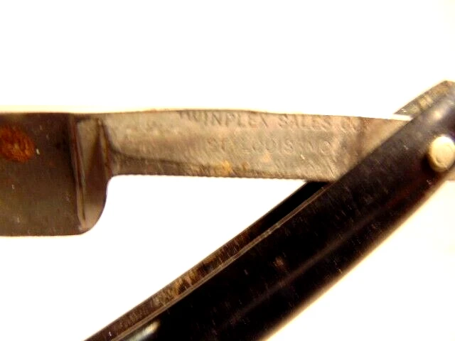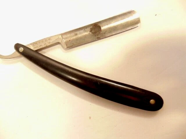 Here is an older straight razor marked Winplex Sales Co. and T275 F.P.R.W. w ith a black handle. The razor measures about 6 1/2 inches total length when closed. The blade measures 5 1/2th inches long and is about 5/8th inches wide. The blade shows dirt, wear, tarnish and spots of corrosion. The handle shows some wear or damage on one side near the tail end. P lease see the pictures and ask any questions. Thank you for looking. (Inv A24,455)