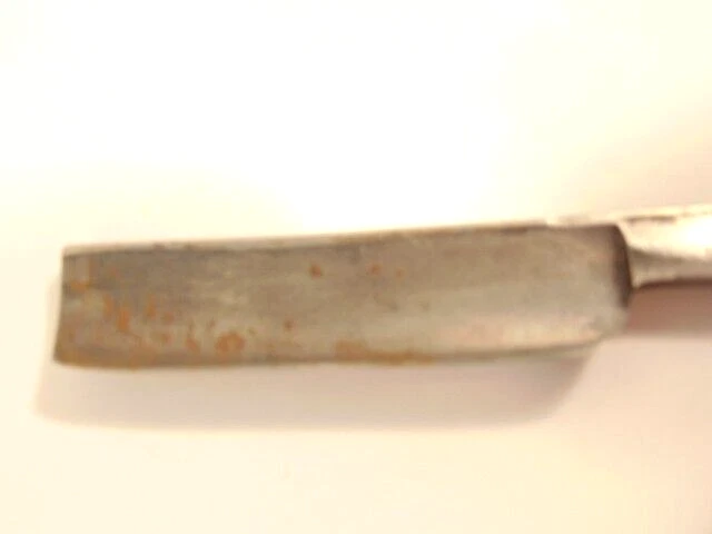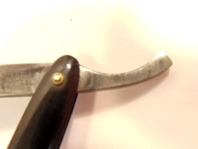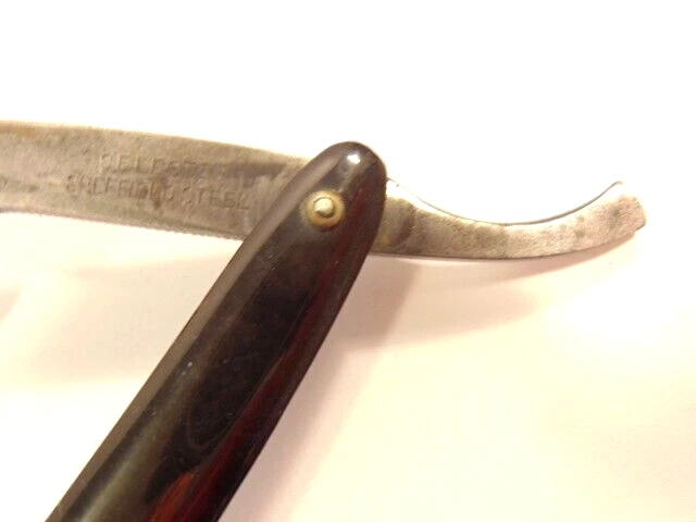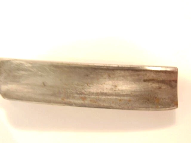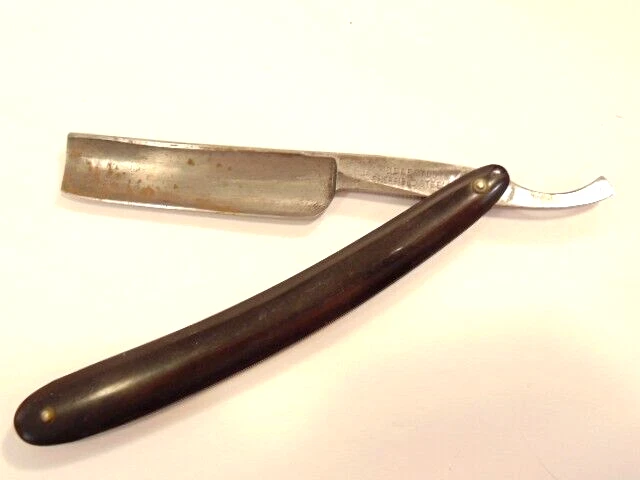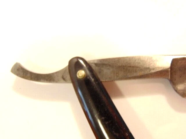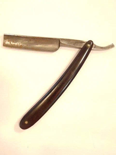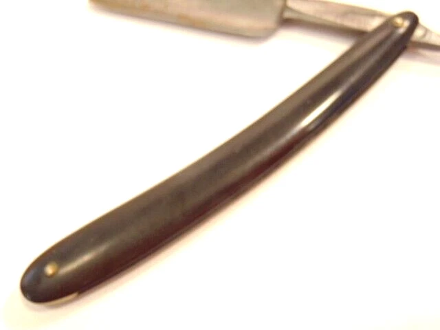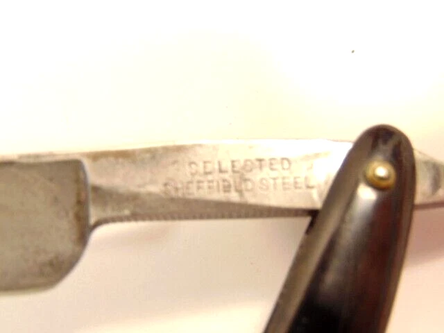 Here is a pre-owned older unbranded straight razor with a black handle. The blade is marked near the rivet "Selected Sheffield Steel", but it does not show the maker. It measures about 6 1/2 inches long. The blade itself measures about 5 3/4 inches long and is about 3/4 inches wide. It is attractive but used with some tarnish, dirt and wear typical from normal use and some very small light areas of corrosion. Please see the pictures and ask any questions. Thank you for looking. (Inv 23,369)