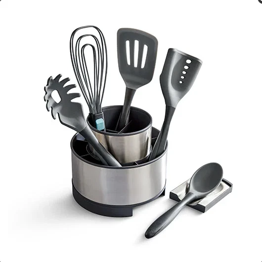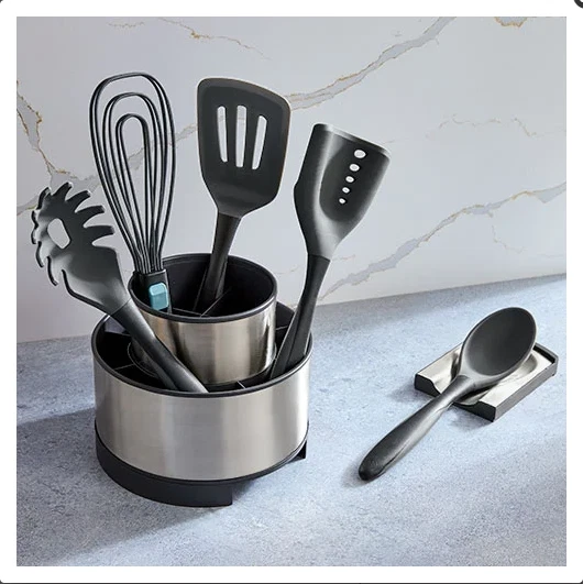 Utensil Starter Set These versatile kitchen tools have a stainless steel or nylon core under the seamless silicone exterior, so they can easily pick up, scoop, stir, chop, or whisk your food without scratching your cookware. The silicone outer layer is safe to use on all cookware surfaces and loved for its durability, heat resistance, and slip-resistance. The ergonomic soft-grip handle is comfortable to hold. Keep these essential cooking tools within reach in the Stainless Steel Rotating Utensil Holder. Product Details Set includes: Silicone Spoon The Silicone Spoon can stir and serve whatever you're dishing out. The spoon's head features a nylon core that is durable for scooping food. Silicone Pasta Fork The Silicone Pasta Fork is great for serving pasta or mixing it with sauce, veggies, or meat. The fork's head features a nylon core that is durable for scooping spaghetti, linguine, fettuccini, and angel hair pasta. The tines easily hold on to noodles without tearing or breaking them. Silicone Slotted Turner The Silicone Slotted Turner can flip, stir, lift, and transfer foods with grease or liquid like burgers. The head of this turner has a stainless steel core that is sturdy but also flexible enough to give it just the right bend to glide under food easily. Mix 'N Chop Spatula Chop, drain, scoop, and serve all with one tool. It has a curved design for the rocking and chopping motion you need to crumble and brown ground beef, turkey, and sausage. It has a spatula area and drain holes to scoop ground meat out of grease and serve it easily. You can also mash and serve avocadoes and eggs or crushed tomatoes for a sauce. The chopper-spatula hybrid features a head with a nylon core that is durable for chopping and scooping food. Whisk Tongs These multipurpose flat whisk tongs, the ultimate kitchen tool, make cooking easy and reduce tool clutter in your kitchen. With just one tool, you can whisk cake mix, grab hard-boiled eggs, flip burgers or bacon, toss salad, and serve food. The adjustable handle helps you easily switch between locking it in a whisk or tong position—saving you tons of space when you’re storing it away. Plus, the tongs are dishwasher-safe for easy cleanup. Stainless Steel Rotating Utensil Holder Keep your favorite cooking tools and utensils at your fingertips any time in the Stainless Steel Rotating Utensil Holder. The exterior is gorgeous stainless steel, so it matches any kitchen. The interior is plastic so it's easy to clean. Remove the center compartment and the hidden spoon rest to cook any way you like. 7½" diameter, 6½" tall.