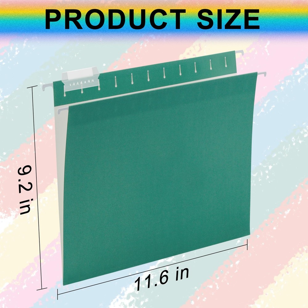 pmybupo Green Hanging File Folders 6 Pack Letter Size letter size, Description Features: Effective Filing:Includes 6 letter size hanging file folders (11-3/4" W x 9-1/4" H exclusive of rods and tabs)are designed to save desktop space,that keep your papers neatly upright in desk drawers and file cabinets Sorted Tabs:Each hanging folder features a 1/5-cut repositionable poly tab and a sheet of blank label inserts,You can customize your file names on blank label for hassle-free organizing and access to documents. Premium Paper:The green hanging file folder organizer are made of premium material.Reinforced metal coated rod tips that slide easily in file drawers Widely Used:Our decorative file folders are design for letter size paper,suitable for desk drawers,file cabinets or organizer boxes,Suitable for a wide range of color schemes and office décor. It's Lighter On The Inside:Color hanging files have a lighter interior to help prevent accidental time-wasting misfiles between folders,Hanging files with a scratch line at the bottom,you can expand 1 inch according to your needs Product Details: Handling We will ship all orders within 3 business day of payment. Delivery We Do Not Ship Outside of the Continental US. Return Policy All items qualify for returns within 30 days of receipt. Buyer is responsible for return shipping on any item that is not damaged. Feedback We take our reputation seriously, we buy and sell online, so we understand the value of trust. If you are unsatisfied with your order, please contact us and we will work with you to resolve it to your satisfaction.