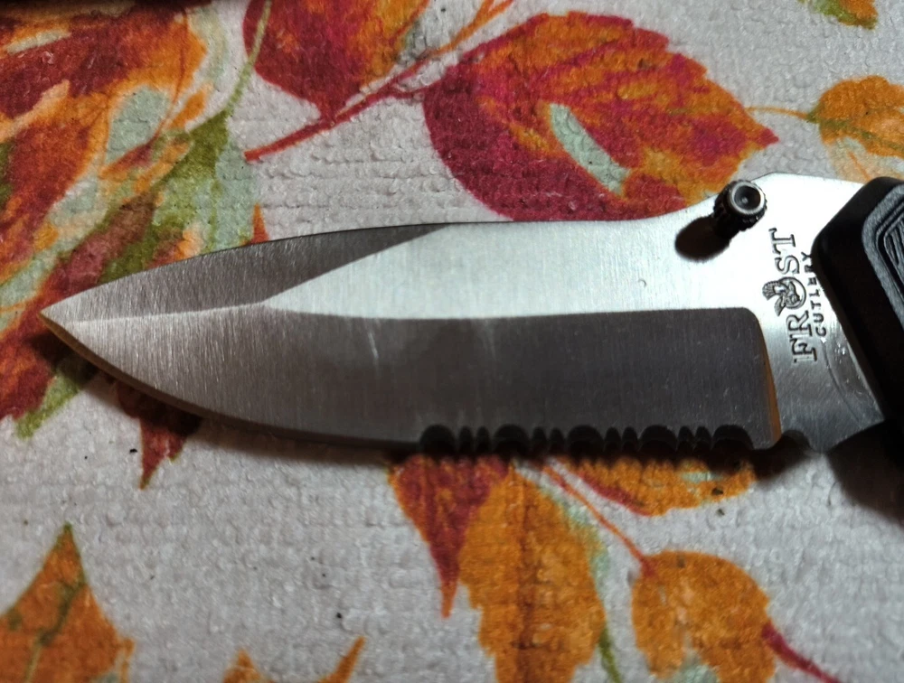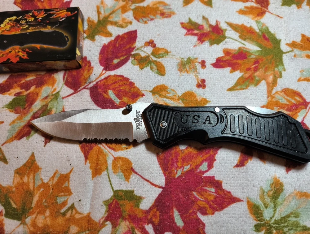 This pocket knife from Frost Cutlery features a black plastic handle and a stainless steel blade with a combination edge. The blade measures between 2.76 and 4 inches, making it a perfect size for tactical use. This original Buckshot model is a great addition to any collection and is factory manufactured in China.