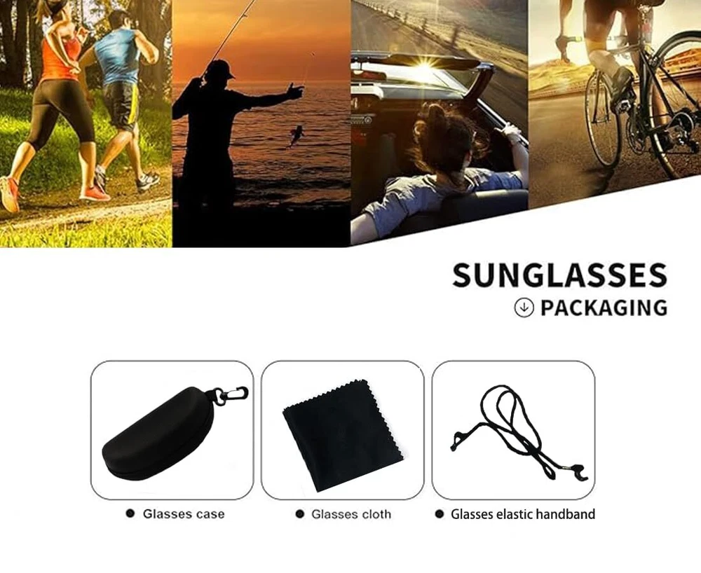 Description sunglasses men mens sunglasses cycling sunglasses polarized sunglasses men sport sunglasses for men running glasses for men UV400 Protection sunglasses HD POLARIZED LENS - protection coating, blocks harmful Rays. Restore true color, eliminate reflected light and scattered light,make the scenery more clear and soft and protect eyes perfectly.Polycarbonate lens are impact, scratch resistant, durable and unbreakable. FRAME TECHNOLOGY- the frame is lightweight, very flexible, heat-resistant and UV-resistant. The sturdy and lightweight frame with non-slip nose pads and improves wearing comfort. Suitable for all face shapes, suitable for all kinds of outdoor sports. LENS TECHNOLOGY- waterproof and hydrophobic coating technology can protect the mirror lens from water corrosion. It can block reflected glare and reduce eye fatigue. Color coatings can improve vision and contrast, and have high definition, impact resistance and scratch resistance. THE BEST CHOICE FOR OUTDOOR SPORTS- best for cycling, climbing, fishing, boating, sailing, water skiing, driving, running, hiking and traveling. Even if you wear it all day, you can hardly feel it. This is your reliable companion when you are outdoors. Lifetime warranty and 30 days unconditional return. We insist on focusing on product quality and the satisfaction of our customers. If you have quality questions or dissatisfaction after receiving the product, please feel free to contact us and we will solve it for you until you are satisfied!