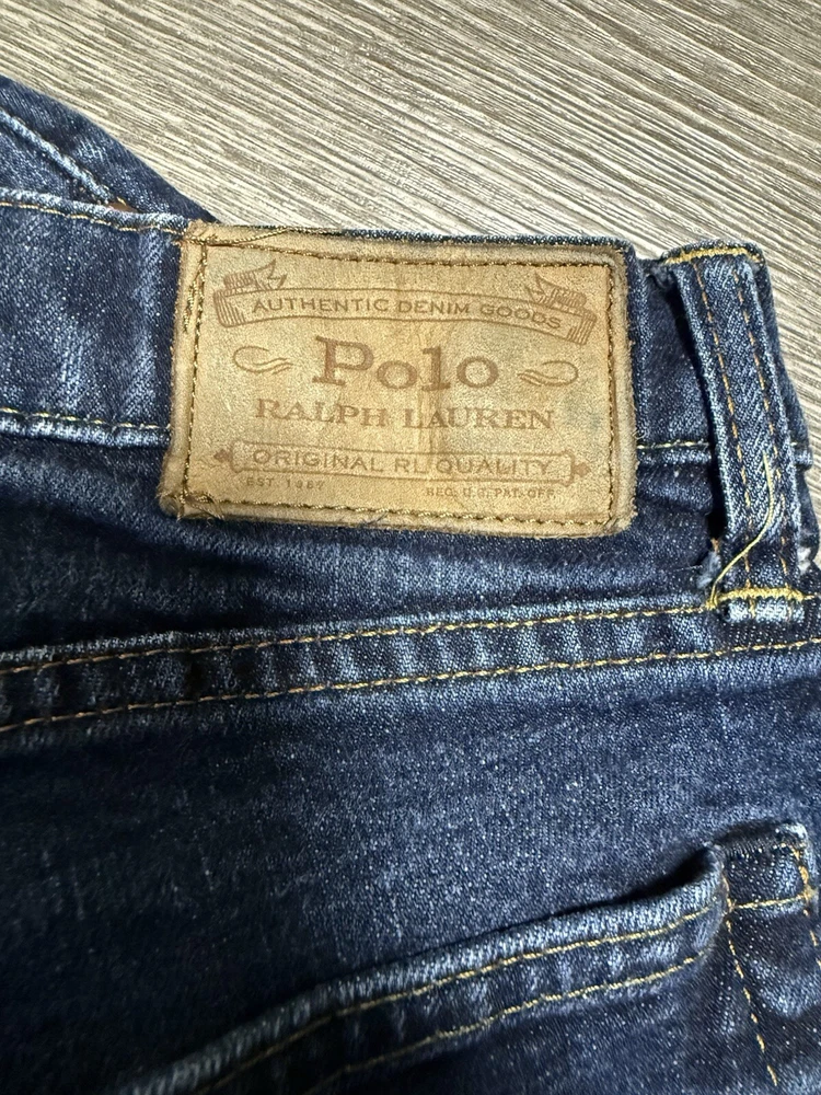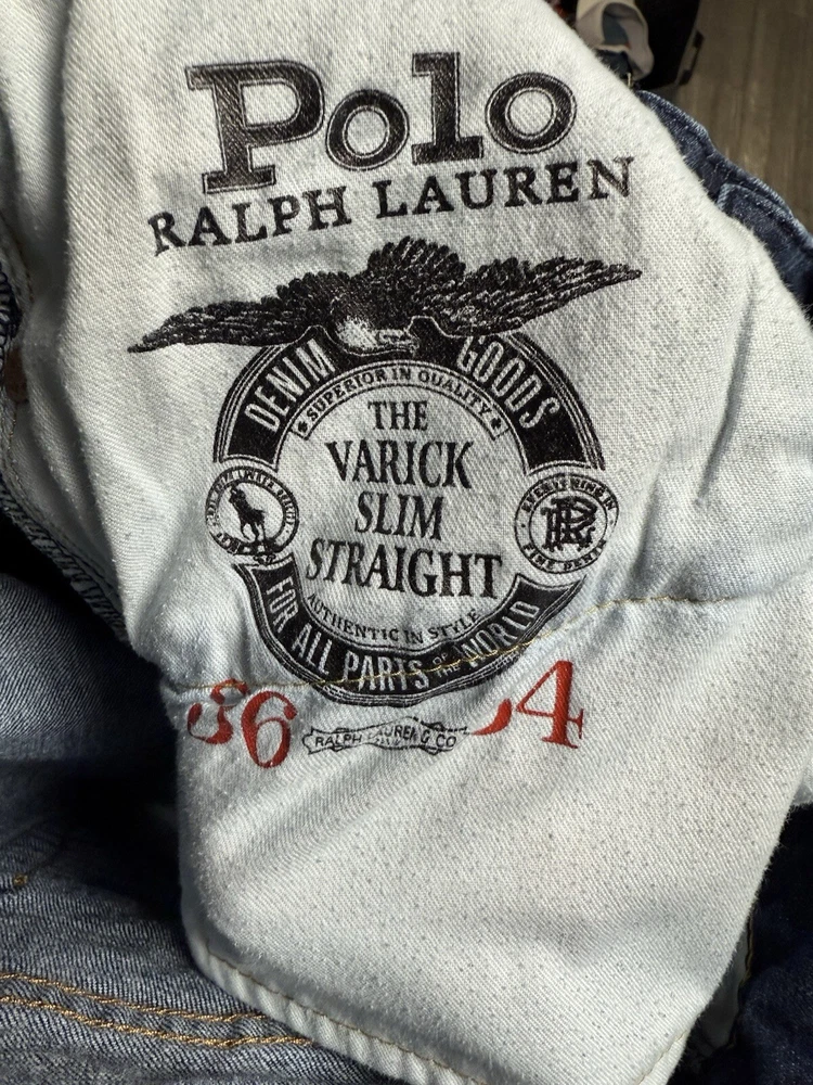 These are Polo Ralph Lauren men's jeans in size 36 with a 34-inch inseam. The jeans are in a blue color and made of cotton denim. They have a slim fit and a straight style, with a vintage look. The brand is Polo Ralph Lauren and the model is Varick Slim, part of the Ralph Lauren Varick product line.