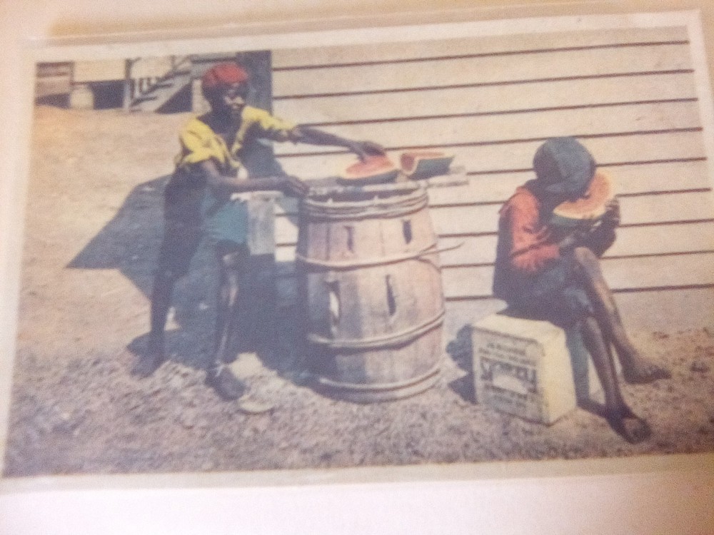 The product is a vintage postcard featuring two black women cutting and eating watermelon. Produced in the United States in 1910, this original real photo postcard captures a moment of friendship and cultural significance. Measuring a standard size of 5.5 x 3.5 inches with a divided back, this postcard is a unique piece that showcases the themes of cultures and ethnicities during the early 20th century. A collectible item that offers a glimpse into the past and celebrates a timeless moment of joy and companionship. A must have for collectors of Negrobelia.