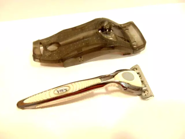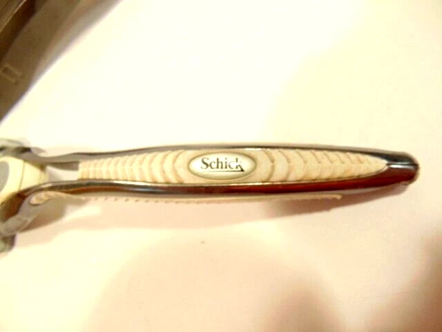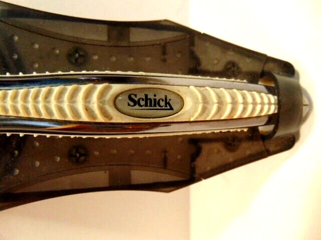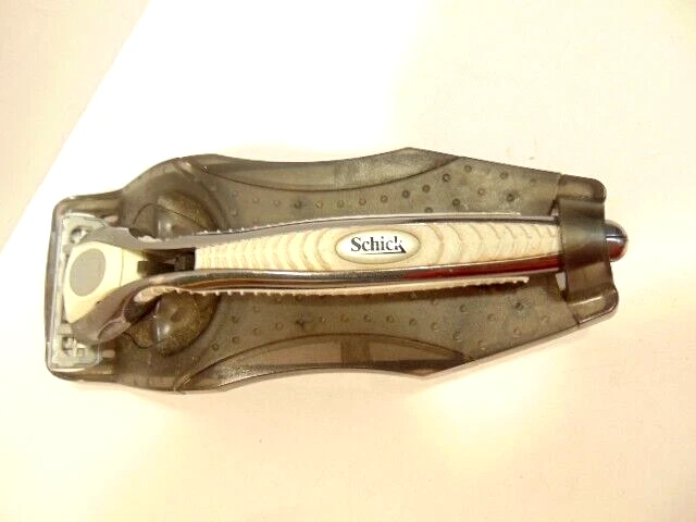 Here is a pre-owned gray Schick safety razor in plastic cradle. It does not show a specific model name or similar information. It currently has a razor blade head - but is assumed used and should be replaced. Please see pictures and ask any questions. Thank you for looking. (Inv A28,804)