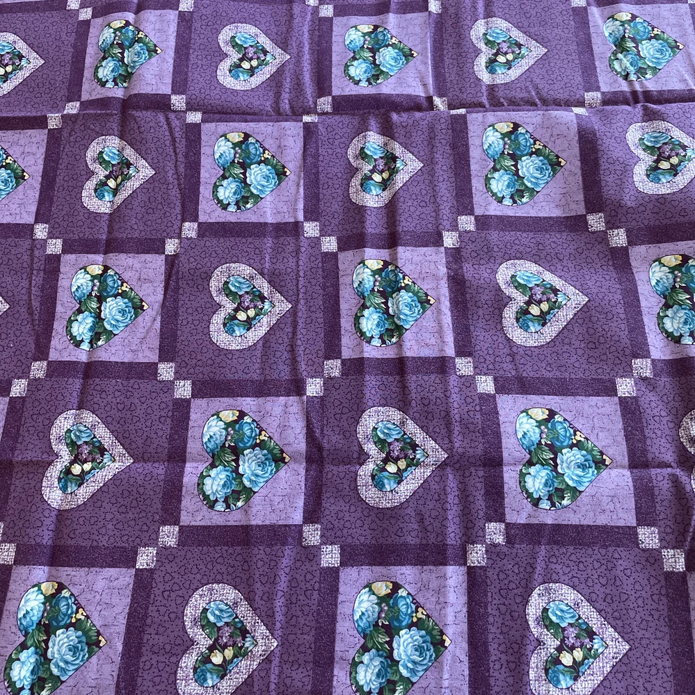 purple heart block blue floral rose patchwork cheater 1.6 yards. Hard to make out maker name; possibly fabri quilt? Comes as 1.6 yards; 60”. Each block measures about 4”x4” has a print flaw on one of the last squares(last picture).