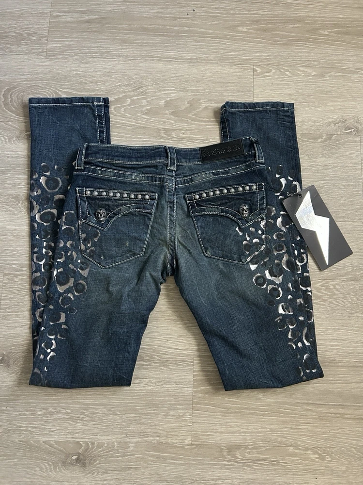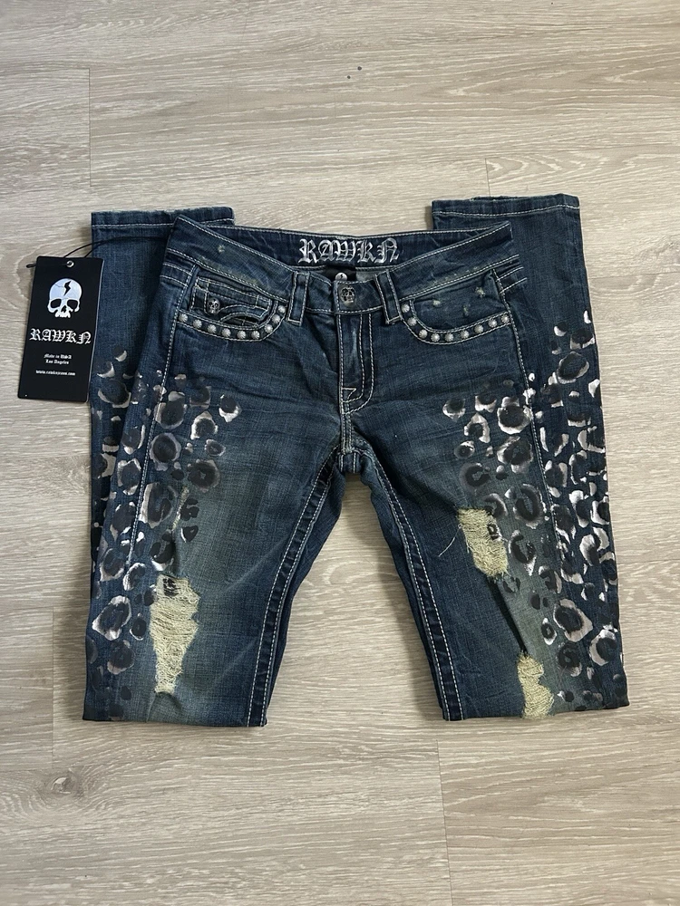 Pattern: Animal Print Accents: Studded, Rhinestone Size: 2 Color: Blue Style: Straight Fit: Regular Waist Size: 26 in Department: Unisex Adults Size Type: Regular Brand: rawkn Type: Jeans