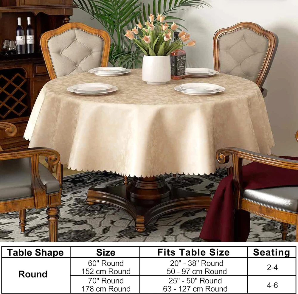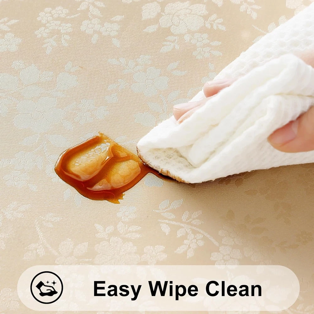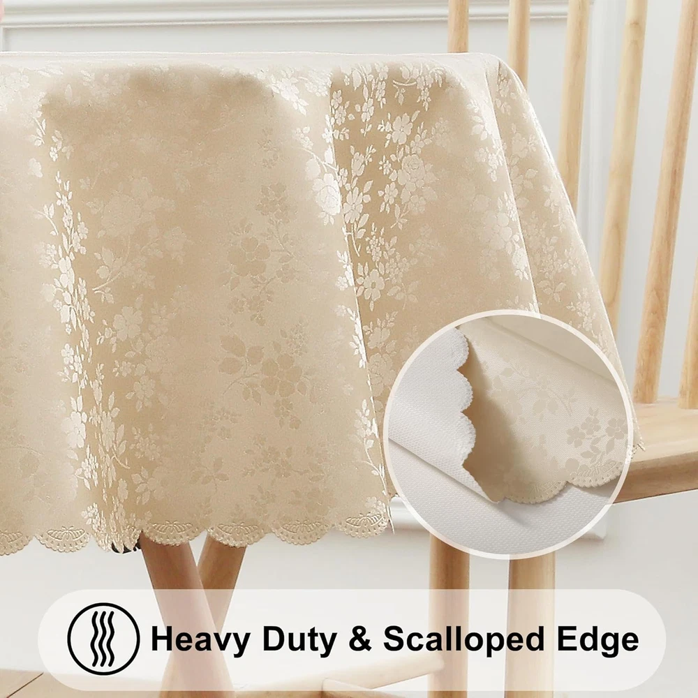 [Elegant Vinyl Tablecloth] Featuring floral embossed tablecloth with pretty scalloped edges, nice warm tone and soft touch add an elegant touch to these tablecloths, they are suited for light up your fancy dinner. [Waterproof and Reusable] Made of premium Polyurethane (PU) with a 3 layer thickening technique, it is waterproof, incredibly soft, and reusable enough to withstand daily spills and scratches. [Easy Cleaning] The surface of the Smiry tablecloth is impervious to water and spills, allowing you to effortlessly wipe away liquids with a damp cloth or napkin. For thorough cleaning, simply toss it in the washing machine with cold water and then dry it on a gentle cycle or under the shade. [No Slip and Nice Drape] Our vinyl tablecloth boasts a thicker build to withstand tearing and abrasion, making it a reliable choice for daily use. Additionally, its substantial weight ensures that it drapes beautifully and stays securely in place on the table. Tip: the wrinkles from transportation will easily disappear after washing and ironing. [Multiple Uses] Smiry offers a range of tablecloths in different sizes and vibrant colors, fits various shapes of tables (rectangle, oval, and square); suit for any holidays, casual dinner or a formal event, creates a warm and festive setting in indoor or outdoor use! Product Description More options from smiry Waterproof & Spillproof Waterproof film, won't let liquids drip through tablecloths Waterproof & Spillproof Waterproof vinyl surfaces insulate our tablecloths from milk, oil. Waterproof & Spillproof Liquid does not easily penetrate the tablecloth Easy Clean Wipe with a damp cloth or sponge, also machine wash in cold water Easy Clean just use a rag or paper towel to easily wipe off the stains. Easy Clean The tablecloths can be machine washed separately with cold water
