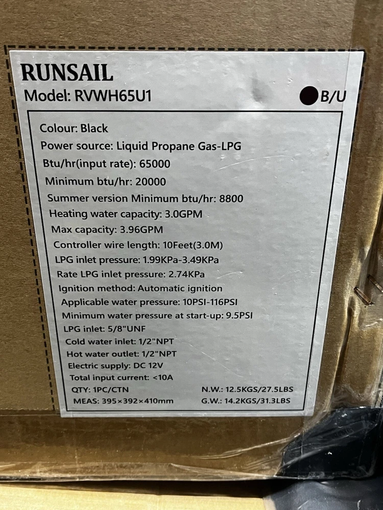 Runsail tankless water heater for RV. Propane, 12 volt, remote control, digital readout, 65,000 BTU, black in color.