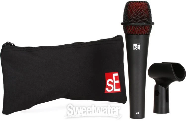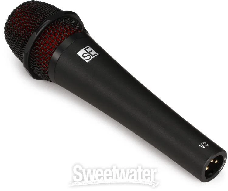 A New Contender from the sE V Series sE Electronics made waves last year with its V7 stage microphone. From the same family comes the more affordable sE Electronics V3 microphone for voice and instruments. The V3 shares the V7's all-metal design to survive the rigors of the road, roll-preventing bevel, and internal shockmount and windscreen to keep stage noise to a minimum. But unique to the sE Electronics V3 are its open-sounding dynamic polar pattern — better suited to guitar cabs, for instance — specialized copper voice coil, and finely tuned frequency response to accurately capture any source onstage including lead and backing vocals, guitars, drums, horns, and more.Not a fan of the red screen? The sE V3 also includes a black screen for traditionalists.Integrated shockmount and internal windscreen ensure top-notch onstage performance When you take the stage with the sE Electronics V3, you don't have to worry about Sweetwater is an Authorized sE Electronics Dealer Genuine New Item Sweetwater's 2-year warranty sE Electronics V3 Cardioid Dynamic Vocal Microphone Handheld Dynamic Microphone with Cardioid Polar Pattern and 50Hz-16kHz Frequency Range A New Contender from the sE V Series sE Electronics made waves last year with its V7 stage microphone. From the same family comes the more affordable sE Electronics V3 microphone for voice and instruments. The V3 shares the V7's all-metal design to survive the rigors of the road, roll-preventing bevel, and internal shockmount and windscreen to keep stage noise to a minimum. But unique to the sE Electronics V3 are its open-sounding dynamic polar pattern — better suited to guitar cabs, for instance — specialized copper voice coil, and finely tuned frequency response to accurately capture any source onstage including lead and backing vocals, guitars, drums, horns, and more. Not a fan of the red screen? The sE V3 also includes a black screen for traditionalists. Integrated shockmount and internal windscreen ensure top-notch onstage performance When you take the stage with the sE Electronics V3, you don't have to worry about handling noise. An integrated shockmount decouples the V3's capsule, effectively eliminating rumble and other distracting sounds. An internal windscreen reduces unwanted wind noise and plosives. Both red and black windscreens are included, so you can choose whichever one suits your personal style. Heavy-duty metal construction and beveled spring steel grille Built from durable zinc alloy, the road-ready sE Electronics V3 can withstand serious punishment. Its spring steel mesh grille is dent- and corrosion-proof. And courtesy of the grille's beveled edge, this microphone won't roll around when you set it down. Rest assured, you'll be using the V3 for years to come, thanks to its high-quality components, including a gold-plated XLR connector. sE Electronics V3 Dynamic Microphone Features: Cardioid pickup pattern reproduces stage vocals and instruments naturally Suits lead vocals, guitar cabs, horns, drums, and choirs Specialized copper voice coil with neodymium magnet All-metal design (no plastic parts) for prolonged life on the road Beveled grille keeps the mic from rolling around when you set it down Integrated shockmount eliminates rumble and handling noise Internal windscreen prevents wind noise and plosives from ruining your performance Both red and black windscreens are included to suit your style Gold-plated XLR connector resists corrosion 50Hz–16kHz frequency range Includes a mic clip, thread adapter, and carry pouch Specification Detail Microphone Type Dynamic Polar Pattern Cardioid Frequency Range 50Hz-16kHz Output Impedance 600 ohms Sensitivity 2.5 mV/Pa (-52 dB) Color Black Connector XLR Weight 10.4 oz. Included Accessories Mic clip, thread adapter RETURN INFORMATION We want you to be completely happy with your purchase from Sweetwater. If you are not satisfied with your product, you may return it for a refund of the purchase price within 30 days. If your purchase was eligible for Free Shipping, the shipping cost will be deducted from your credit or refund. Returns must be in the complete and original packaging with all accessories and complete documentation (Owner's Manual, warranty card, quick start guides, etc.), show no signs of wear or use, and include a Return Authorization number or be subject to a restocking fee.