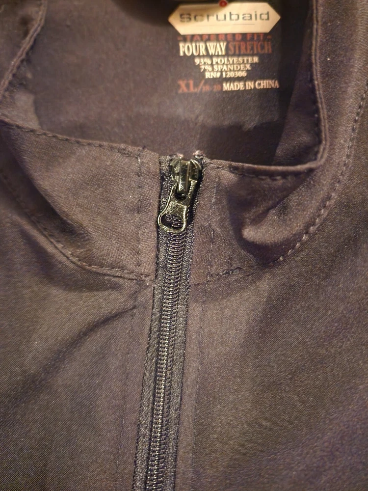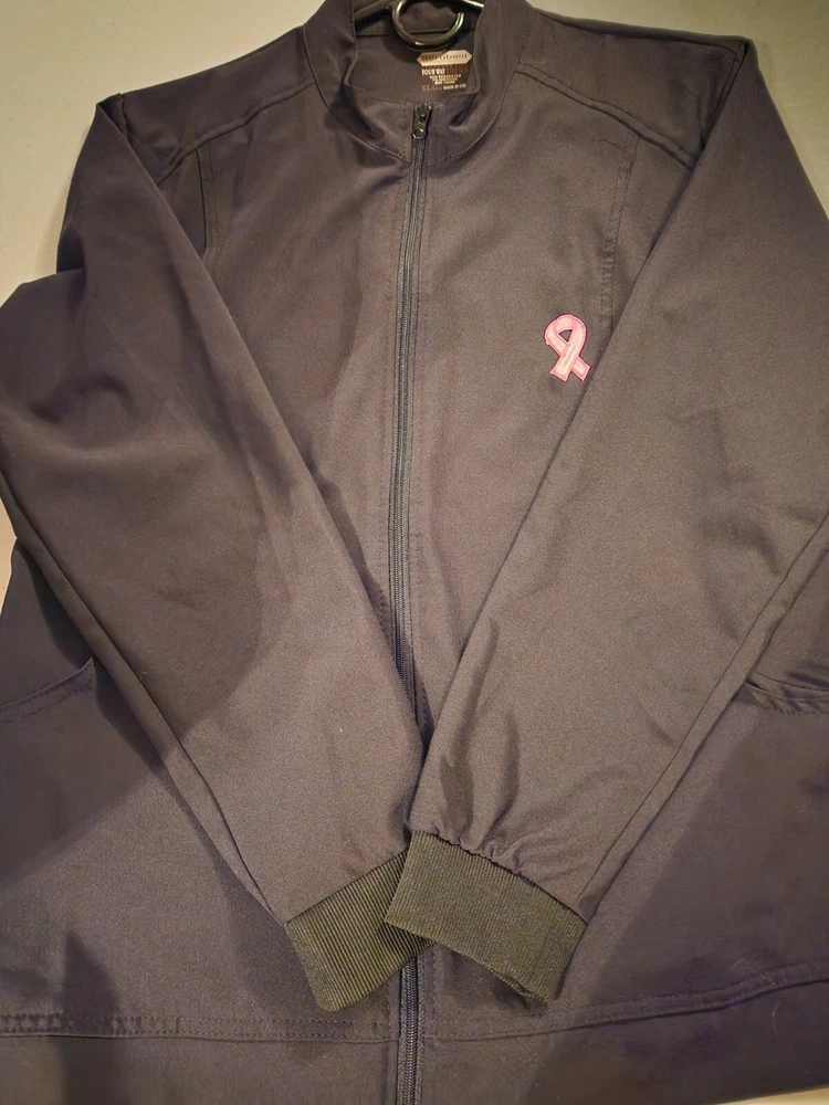 Black scrub jacket, deep pockets, breast cancer symbol on front. What is pictured is what it is.