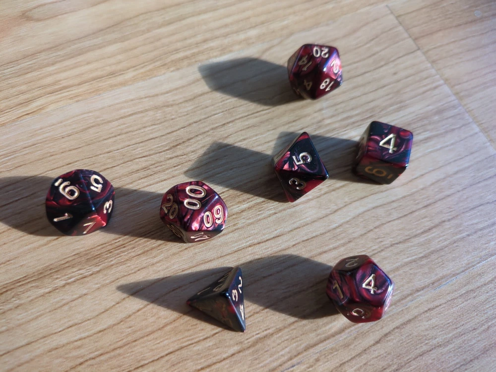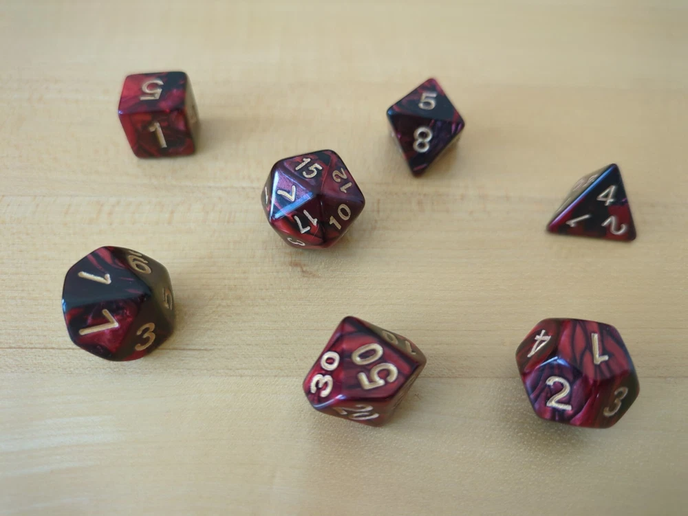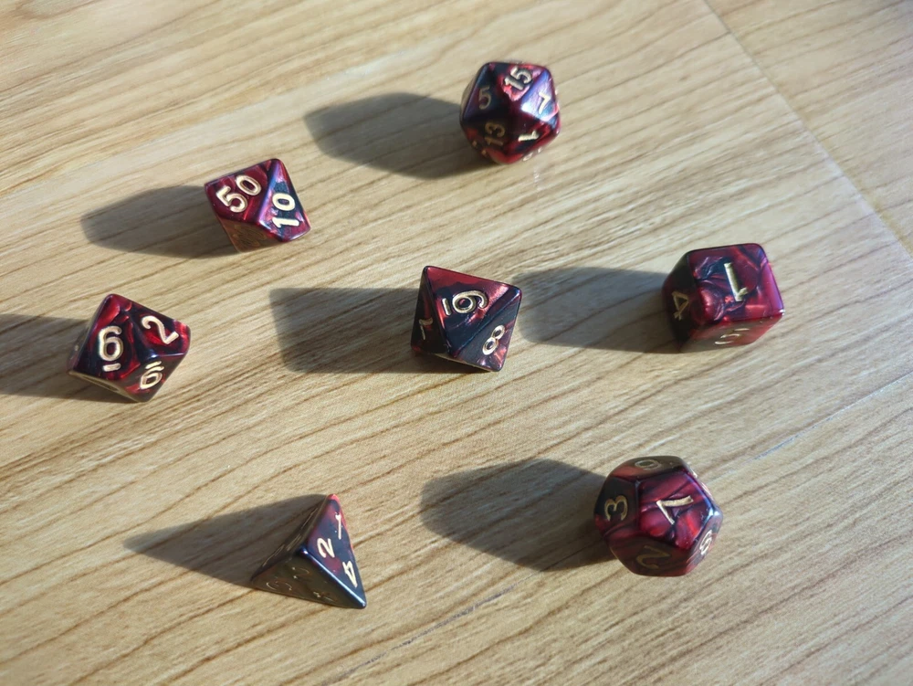 Set of seven new dice: D4, D6, D8, D10 (single-digit), D10 (double-digit), D12, and D20. The dice shown in the photo are the actual ones you will receive. They will be shipped inside a small padded envelope.