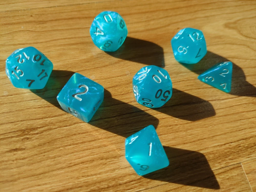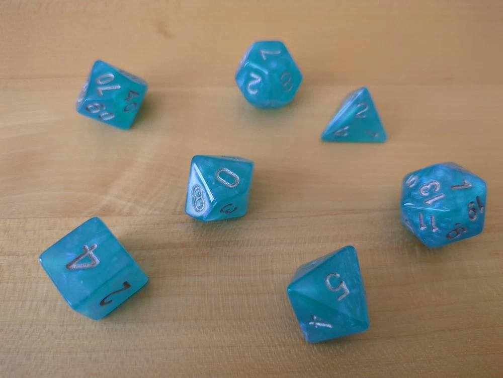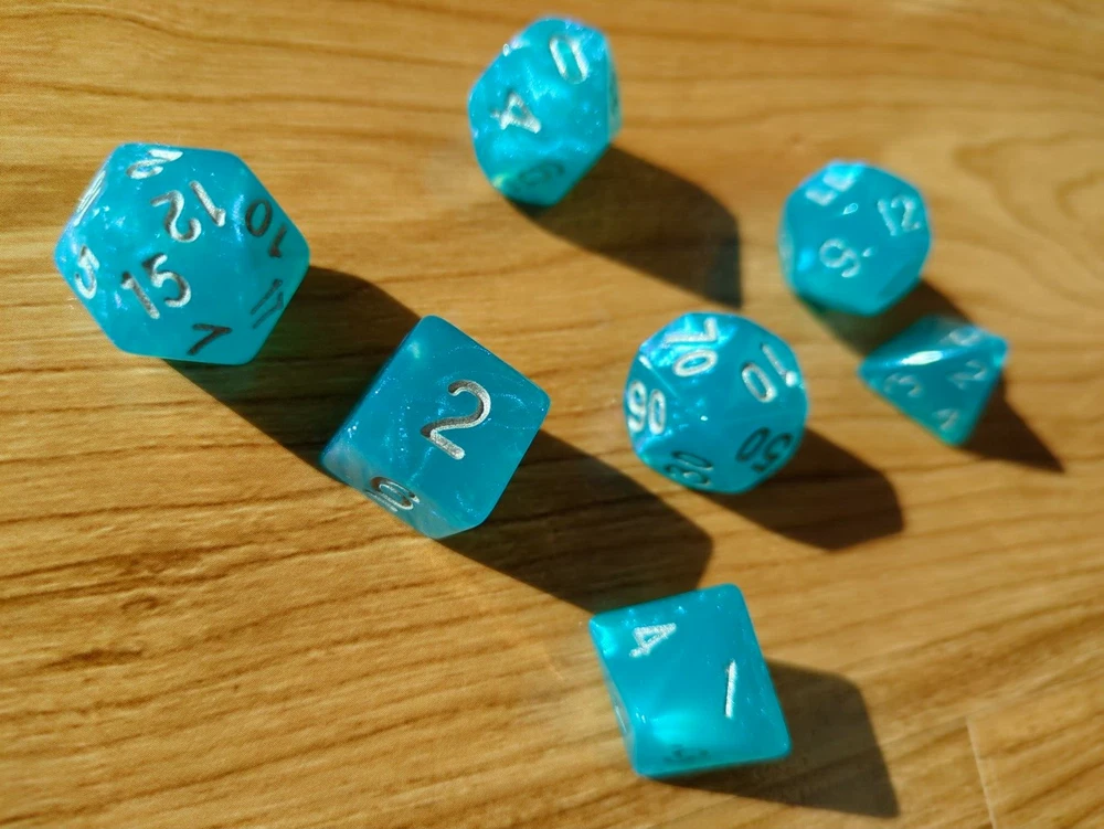 Set of seven new dice: D4, D6, D8, D10 (single-digit), D10 (double-digit), D12, and D20. The dice shown in the photo are the actual ones you will receive. They will be shipped inside a small padded envelope.
