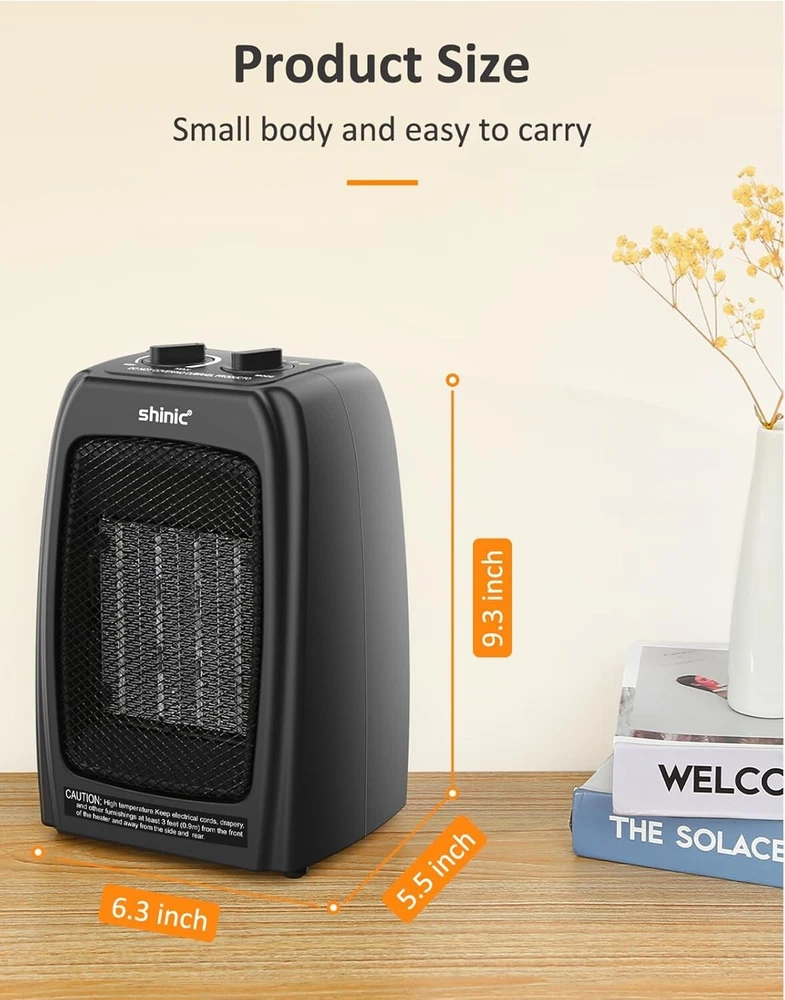 【3 Modes with Thermostat Control】3 Heat Settings; LOW: 900 watts of heat; HIGH: Output heat faster and hotter at 1500 watts; FAN: Blow out cool winds. Electric space heater with thermostat manual control, designed for comfort and warmth, keeping your small room at a set temperature and saving your electricity bills. 【1S Fast Warm-Up】With the PTC ceramic heating technology and high-speed fan, this small space heater can warm you in 1 second! Range up to 200 sq.ft. Saving electricity bills by heating the small space required, instead of using other centralized indoor space heaters. Stay warm and comfortable in your space in the cold once you pick up this energy efficient space heater. 【Multiple Advanced Safety Design】 Overheat and Tip-Over Protection: Aut-off when accident happens, perfect for family with kids and pets; V0 Flame Retardant Material; ETL Listed. The Shinic ceramic space heater, a solid choice for small room,office, living room and bedroom! 【Quiet Space Heater】The operating sound of the office sapce heater is less than 38 dB, quiet enough for most people to use in a bedroom while sleeping, a perfect desk space heater never disturbs you when you sleep or work. 【Space-Saving Desk Space Heater】Dimensions: 6.3 x 5.5 x 9.3 inches; small space heater for office under desk quiet, warm and space-saving. Warm up your body/feet/legs in an instant, but only take a small space. Easy-to-move portable space heaters for indoor use with convenient carry handle and 6 Ft long cord.