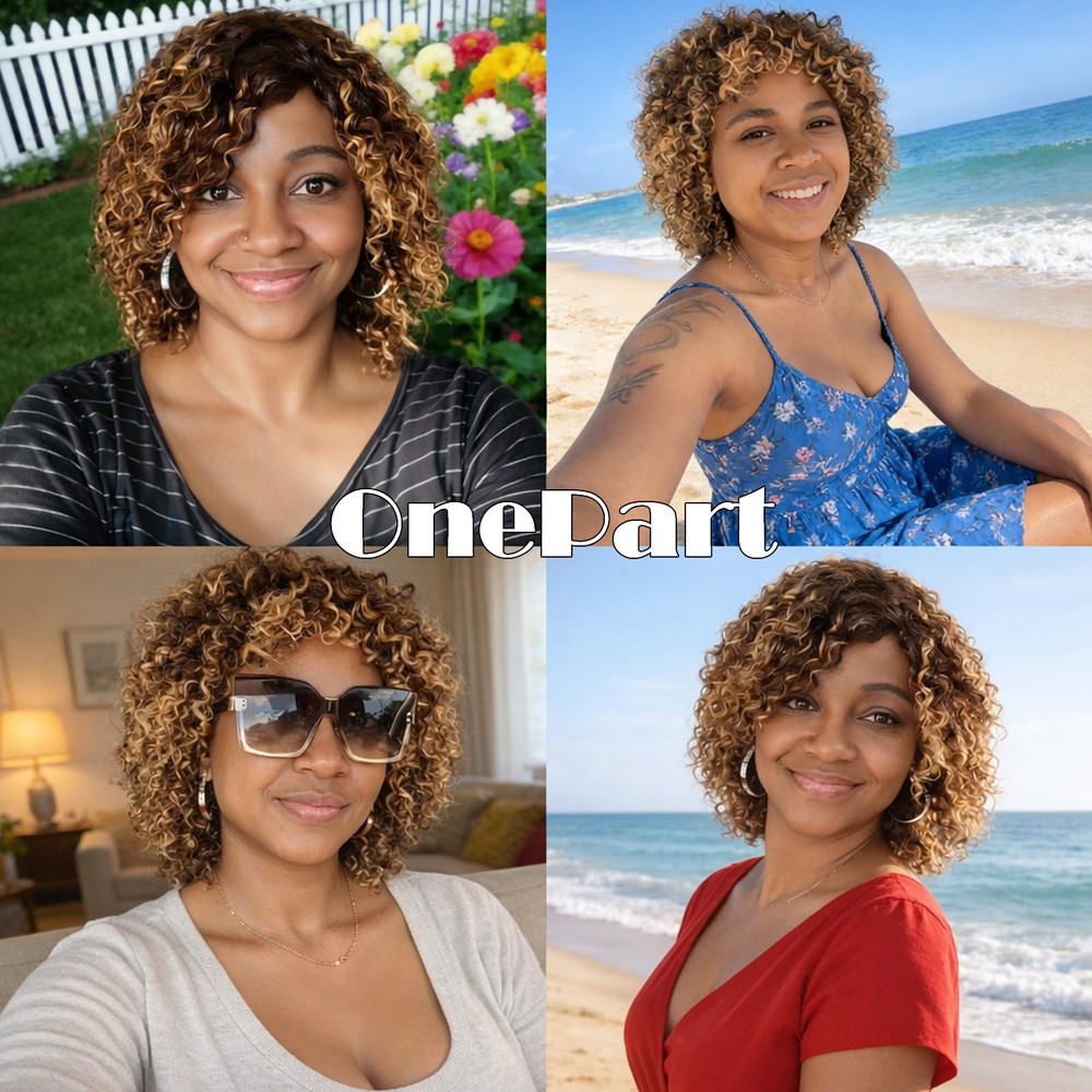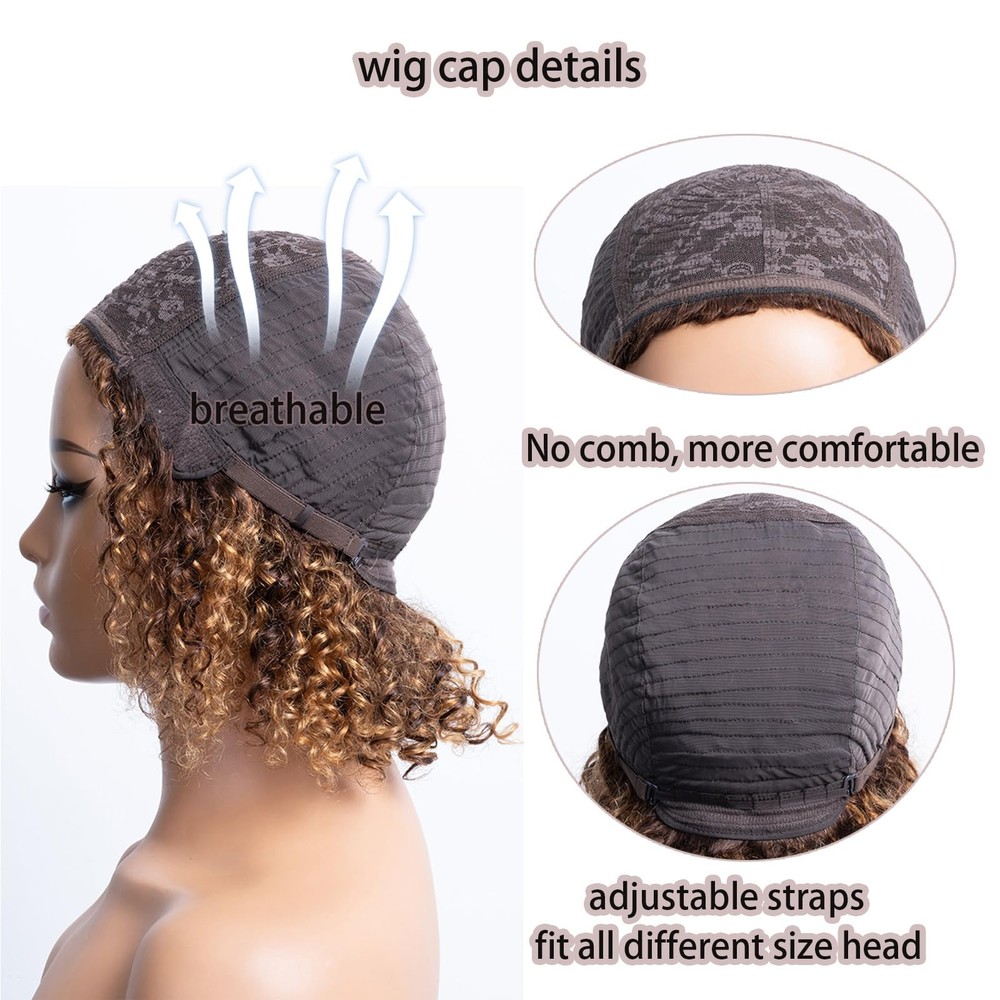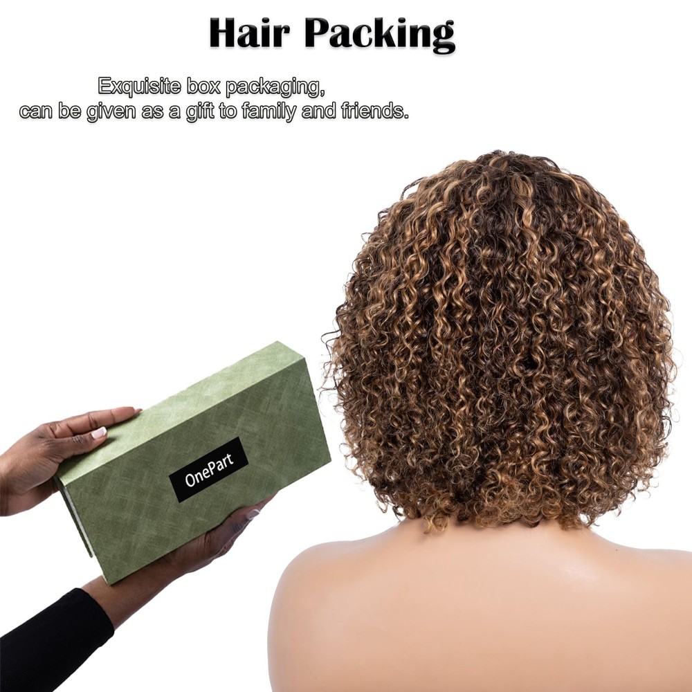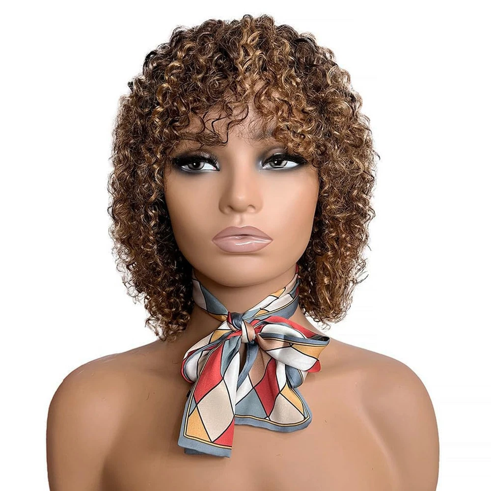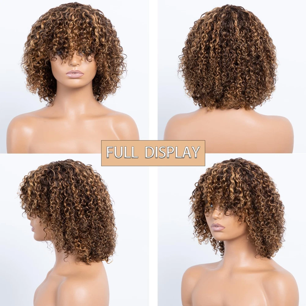 short kinky curly wig with bangs for black women 100 percent human hair machine made glueless jerry curly brown blonde wig human hair 4/27 12inch HAIR MATERIAL:100% unprocessed virgin brazilian human hair. soft and natural, clean and healthy GLUELESS WIG:glueless machine made water wave wig, spend less time, easier to wear and take off, more afforable SUITABLE TO ALL AGES AND MULTIPLE OCCASIONS:sylish and realistic, suitable and be loved by women of all ages. for daily use, parties, outdoor, cosplay, be a gift for your friends, suitable for multiple occasions HAIR QUALITY:bouncy curl, soft and smooth touching, tangle free and shedding free DIFFERENT COLORS:wigs are with plenty of colors for your choice, fit for different ages and occasions