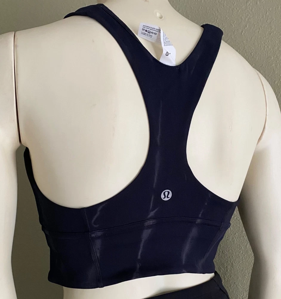 Support Level: Medium Type: Bra Occasion: Activewear Performance/Activity: Any Performance/Activity, Athleisure, Bodybuilding, CrossFit, Cross Training, Gym & Training, Running & Jogging, Yoga Size Type: Regular Garment Care: Machine Washable Underwire Type: Wireless Department: Women Size: 4 Material: Nylon Blend Band Size: S Cup Size: C Pattern: Tie Dye Color: Black Cup Coverage: Full Strap Type: Crossback Closure: Pullover Style: Sports Bra Brand: Lululemon Personalize: No Features: Breathable, Lined, Moisture Wicking Fabric Type: Blended Fabric