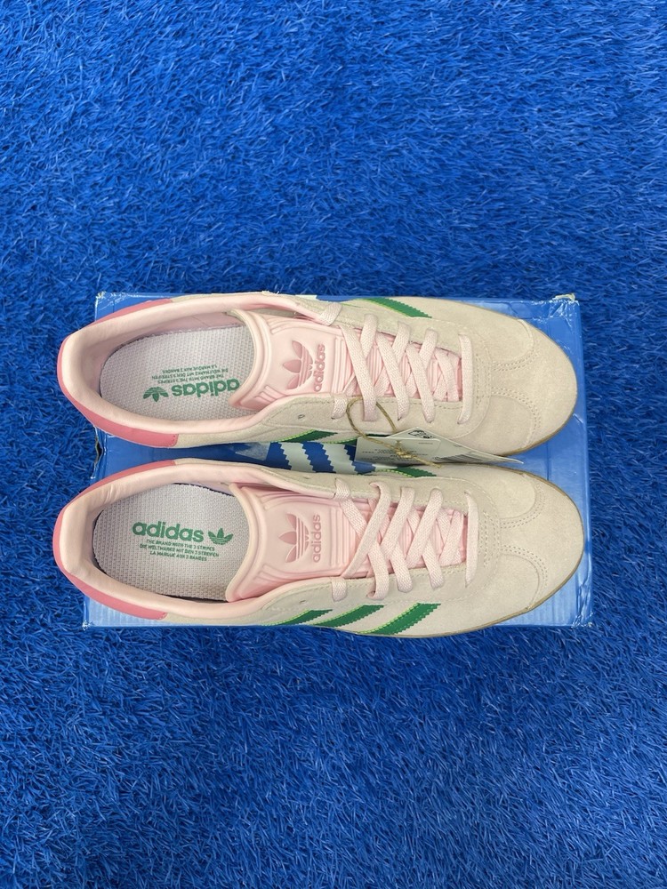 The product is a pair of Adidas Gazelle J Clear Pink Court Green Youth Kids sneakers in size 6Y. These low-top lace-up shoes feature a solid pink color with a logo accent. Made with suede upper material and a rubber outsole, they are designed for athletic activities, suitable for activewear occasions. The Gazelle Shoes Kids model is part of the Adidas Gazelle product line and is recommended for unisex kids in the summer, fall, and spring seasons. Made in Indonesia, these sneakers offer both style and comfort for young wearers.