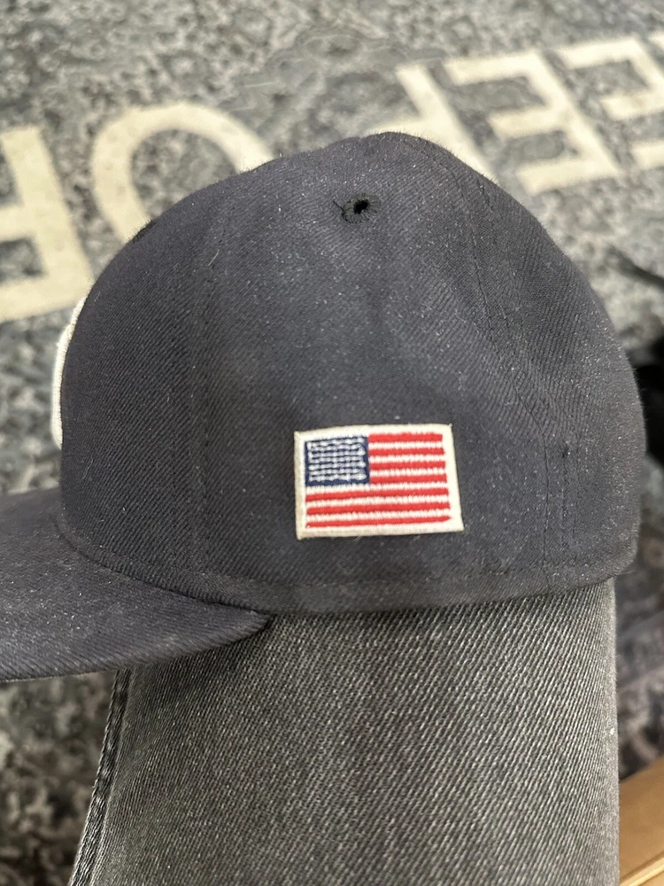 preowned. 7/10 worn condition. slight dirt/aging on hat/ inside hat/under brim. hat creasing. rare finds. see pics for more.