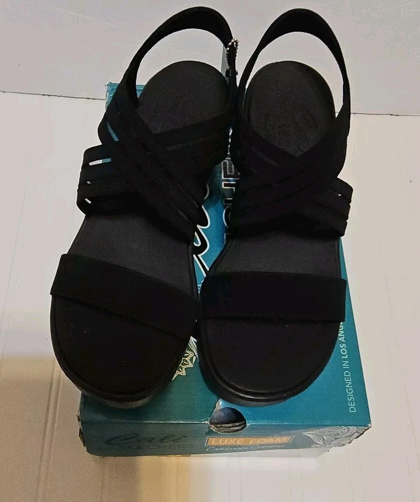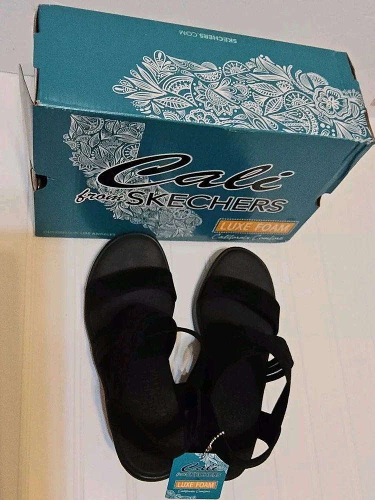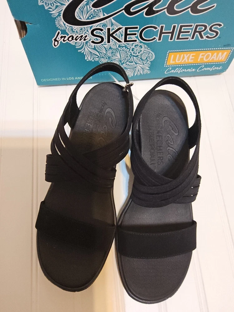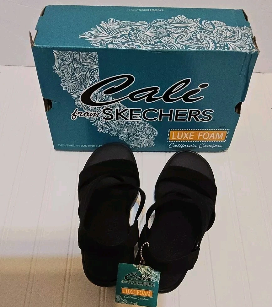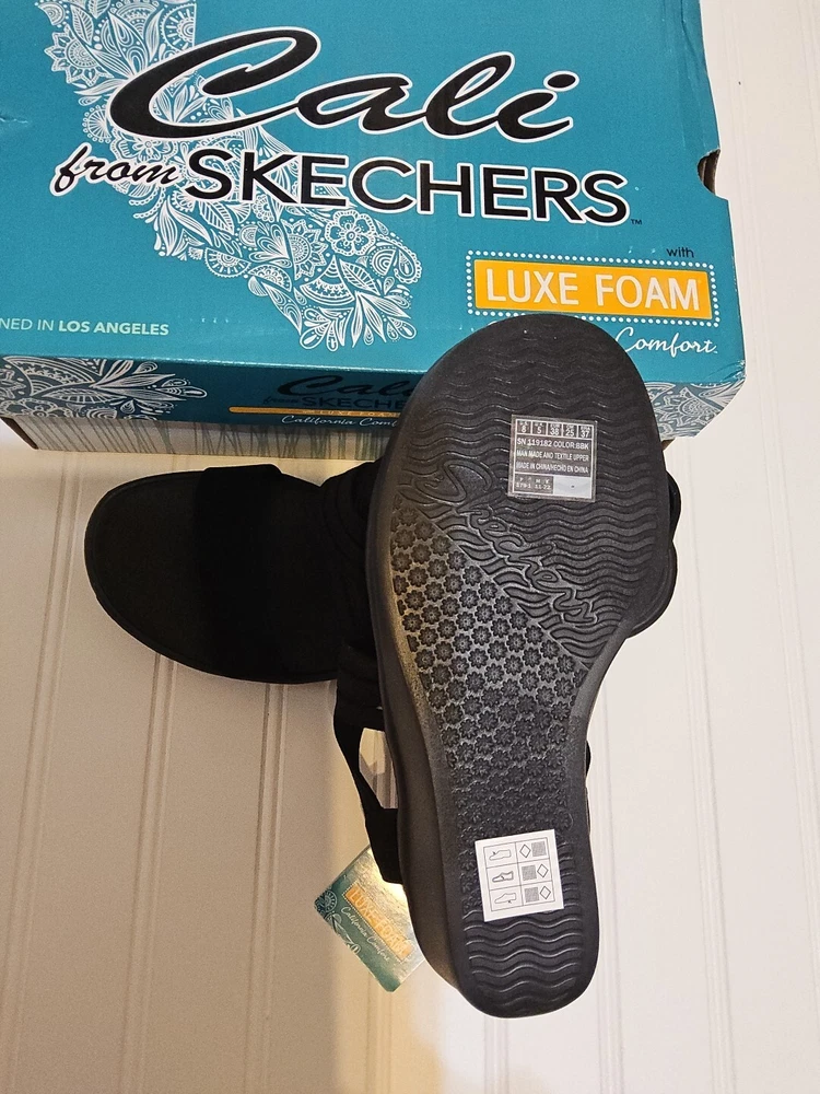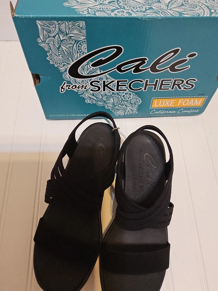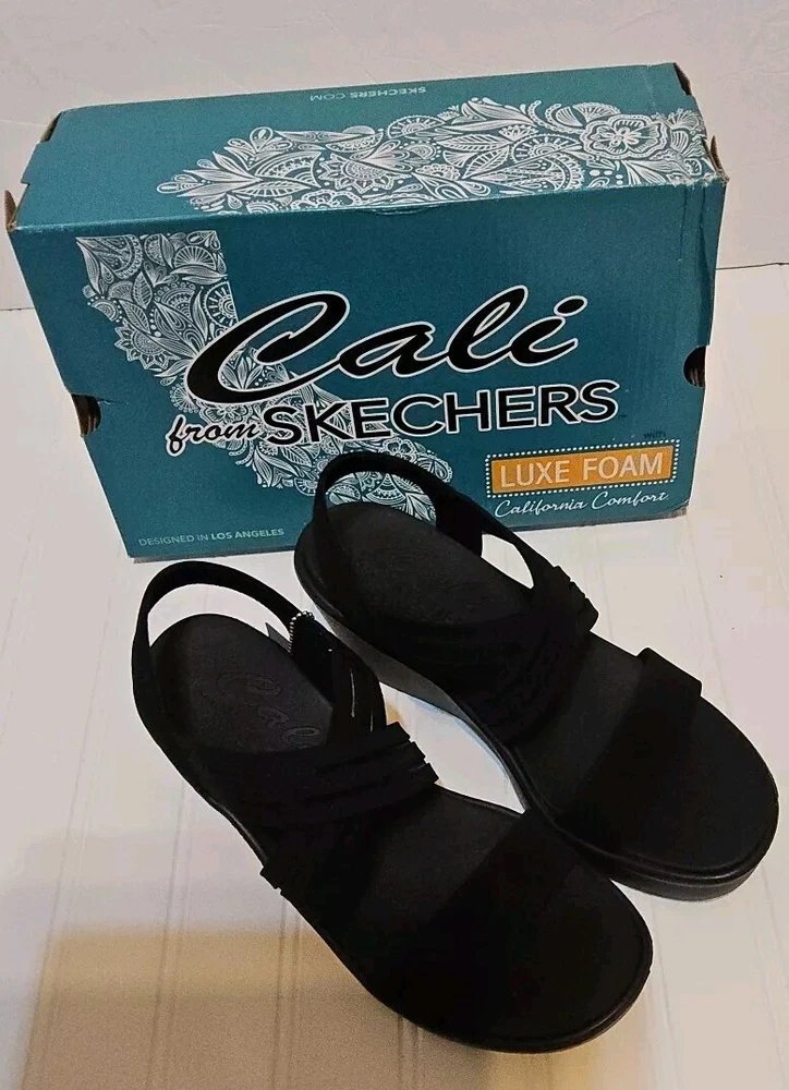 Step out in comfort and style with these sleek Skechers Cali sandals. Featuring a classic black synthetic upper and a versatile solid pattern, these sandals are perfect for any occasion. The slip-on design makes them easy to wear, while the wedge heel provides a comfortable lift. With a mid-height heel, these sandals offer both style and comfort, perfect for those long summer days. The breathable material ensures your feet stay cool and comfortable, while the sturdy construction provides durable wear. These sandals are perfect for any woman looking for a versatile, stylish shoe option.