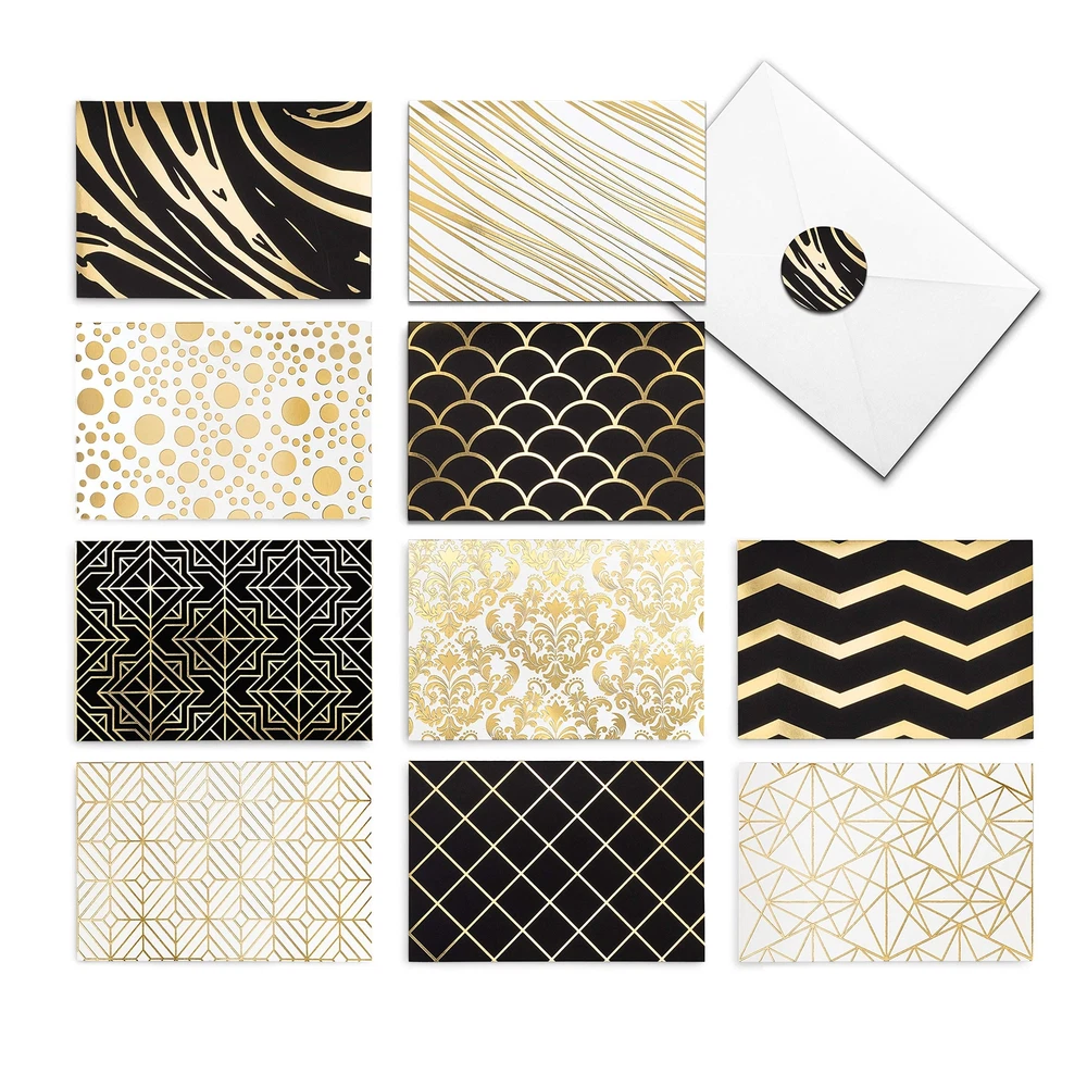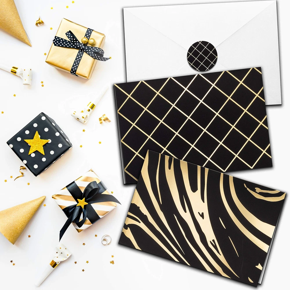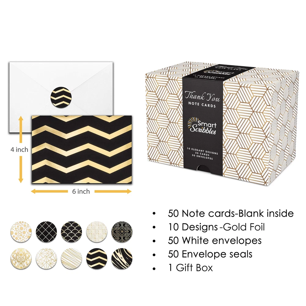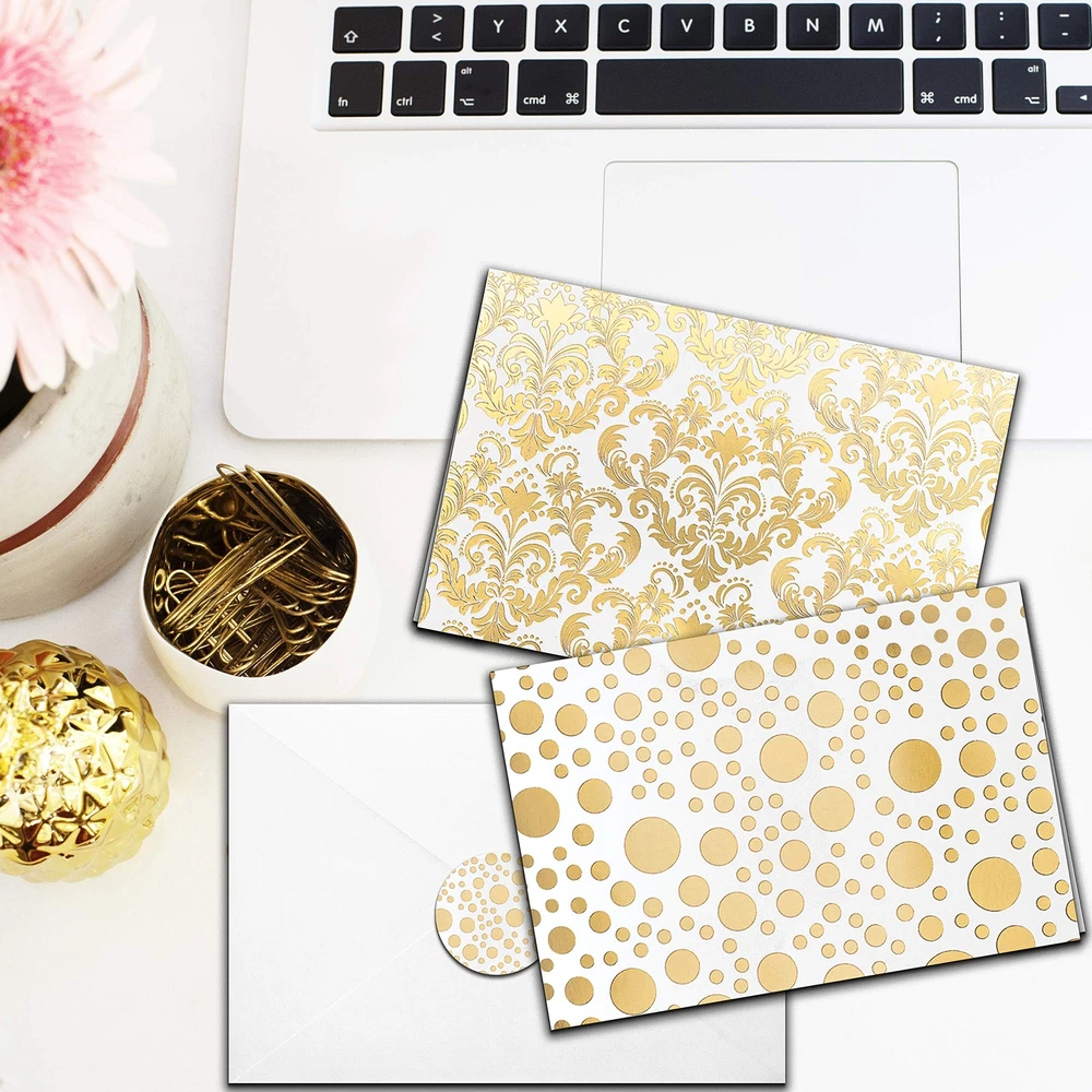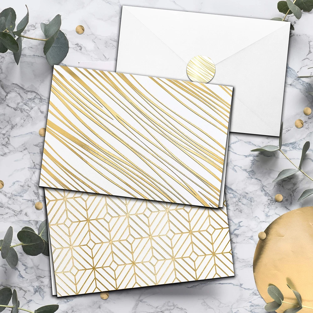 sa ๐๐ ๐ฝ๐ฟ๐ฒ๐๐ ๐ฌ๐ผ๐๐ฟ๐๐ฒ๐น๐ณ ๐ถ๐ป ๐ฆ๐๐๐น๐ฒ ๐ช๐ต๐ฎ๐๐ฒ๐๐ฒ๐ฟ ๐๐ต๐ฒ ๐ข๐ฐ๐ฐ๐ฎ๐๐ถ๐ผ๐ป - Let someone special know you're thinking of them, wish a colleague a happy birthday, or send someone a meaningful thank you card. Our stationary paper and envelopes set has got you covered! ๐ญ๐ฌ ๐๐น๐ฒ๐ด๐ฎ๐ป๐ ๐๐ผ๐น๐ฑ ๐๐ผ๐ถ๐น ๐๐ฒ๐๐ถ๐ด๐ป๐ - Choose from 10 different designs - each one featuring a chic gold foil design and perfect for thank you notes or thinking of you cards. Enough variety to find something that best suits every occasion. ๐๐ป๐๐ถ-๐ฆ๐บ๐๐ฑ๐ด๐ฒ, ๐ฃ๐ฟ๐ฒ๐บ๐ถ๐๐บ ๐ค๐๐ฎ๐น๐ถ๐๐ ๐ก๐ผ๐๐ฒ ๐๐ฎ๐ฟ๐ฑ๐- Our note cards with envelopes are 4x6โโ, perfect for including photos and making birthday wishes or an anniversary card for wife more meaningful. Each blank note card is made on heavy-duty, premium card-stock paper. ๐๐๐๐ผ๐ฟ๐๐ฒ๐ฑ ๐๐ฟ๐ฒ๐ฒ๐๐ถ๐ป๐ด ๐๐ฎ๐ฟ๐ฑ๐ ๐๐ผ๐ฟ ๐๐น๐น ๐ข๐ฐ๐ฐ๐ฎ๐๐ถ๐ผ๐ป๐ - Show your appreciation with wedding thank you cards or send thinking of you cards to close friends. These are also great for graduations, holiday good wishes, business thank you cards, baby showers, or Congratulations notes. ๐ฉ๐ฎ๐น๐๐ฒ ๐ฃ๐ฎ๐ฐ๐ธ ๐ฆ๐๐ฎ๐๐ถ๐ผ๐ป๐ฎ๐ฟ๐ ๐ฆ๐ฒ๐ ๐ช๐ถ๐๐ต ๐๐๐๐ผ๐ฟ๐๐ฒ๐ฑ ๐๐ฎ๐ฟ๐ฑ๐ ๐๐ป๐ฑ ๐๐ป๐๐ฒ๐น๐ผ๐ฝ๐ฒ๐- This set includes 50 white envelopes and stickers with which to secure the envelope for a special finishing touch. A convenient storage box ensures you always have all occasion cards at hand.