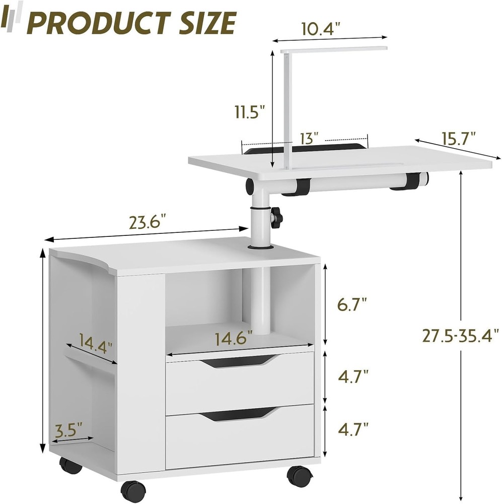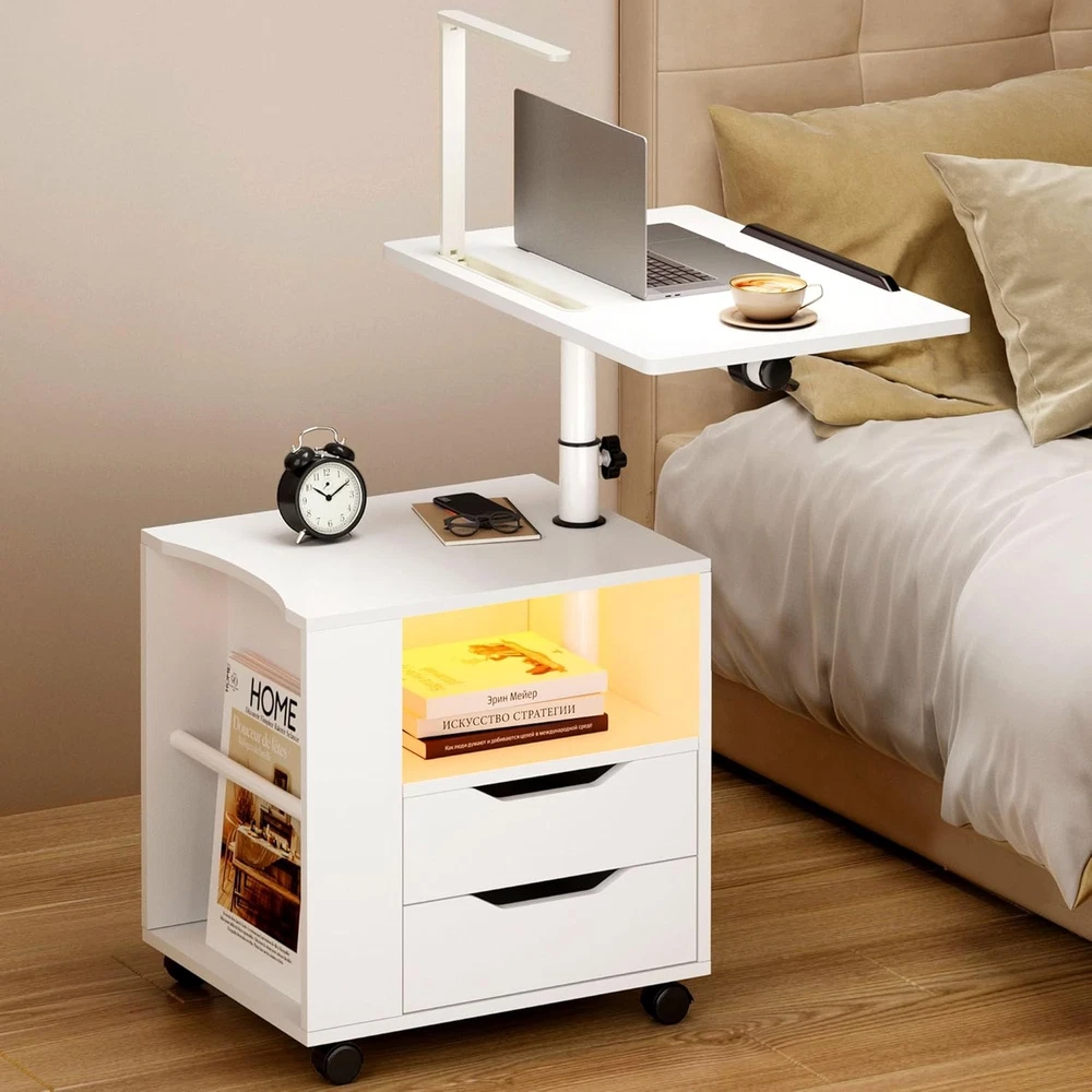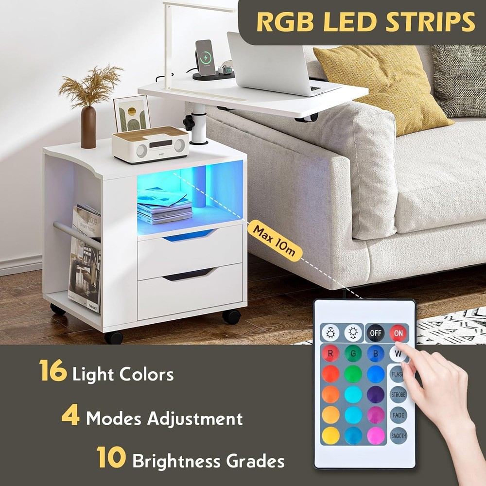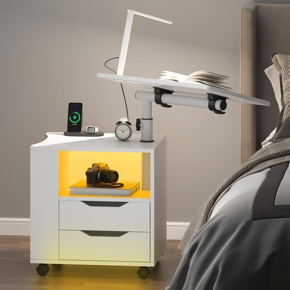 sogesfurniture Nightstand with Drawers and LED Lights, Bedside White-upgrade Product Details Brand: sogesfurniture Product Dimensions: 15.74"D x 18.11"W x 19.68"H Maximum Weight Recommendation: 110 Pounds Color: White-upgrade Table design: Nightstand Item WeightFrame Material: 20 KilogramsMetal Top Material TypeShape: Engineered WoodRectangular Nightstand with Lights: We designed this bedside table with Bluetooth controlled light strip with 1 remote control, featuring 16 light colors, 4 modes, 10 levels of brightness, suitable for all kinds of occasions, creating the perfect ambiance for reading, working or resting. No need for separate lamps to clutter your space. LED Lamp with 3 Charging Ports: Our smart nightstand comes with a foldable and 360°rotating desk lamp, which can easily turn on/off/switch the light by touching the button, providing 3 brightness choices, you can adjust it according to your needs, when it's not in use, it can be easily folded and stored into a fixed slot. Plus, the lamp is designed with 3 charging ports, 2 USB ports + 1 Type C, to meet the charging needs of different devices such as laptop, iPad, mobile phone, headphones. After the lamp is fully charged, it can be used independently. Effortless Mobility with Wheels: The addition of wheels makes this nightstand incredibly mobile. Move it easily from room to room or roll it over your bed as a convenient over-bed table. The wheels of the bedside table can be locked to maintain stability when needed. Adjustable Height & Angle for Your Convenience: With the knob on the stand, you can easily adjust the height and angle of the table top over the nightstand. Whether you use it as a side table next to the bed, sofa, or as a workstation for reading, watching videos, or for your daily work, the height and angle adjustments ensure that it's always at the perfect level. The tabletop is equipped with a slot to keep book or electronic devices firmly in place on the surface. High-quality Material: This multifunctional nightstand is made of premium MDF board and thickened metal frame, the tabletop is waterproof and scratch-resistant and provides excellent load-bearing capacity, maximum load capacity- Cabinet: 110 lbs, Top swivel top: 22 lbs, Drawers: 11 lbs; Overall dimensions: 23.6L * 15.7W * 27.5-35.4H inch. Ample Storage Space: Comes with 2 drawers, 1 open storage compartment and 1 side storage compartment for organizing different kinds of daily items with ease, this nightstand combines style with functionality, making it a perfect bedside companion and a perfect addition to any living room, bedroom, study and office.
