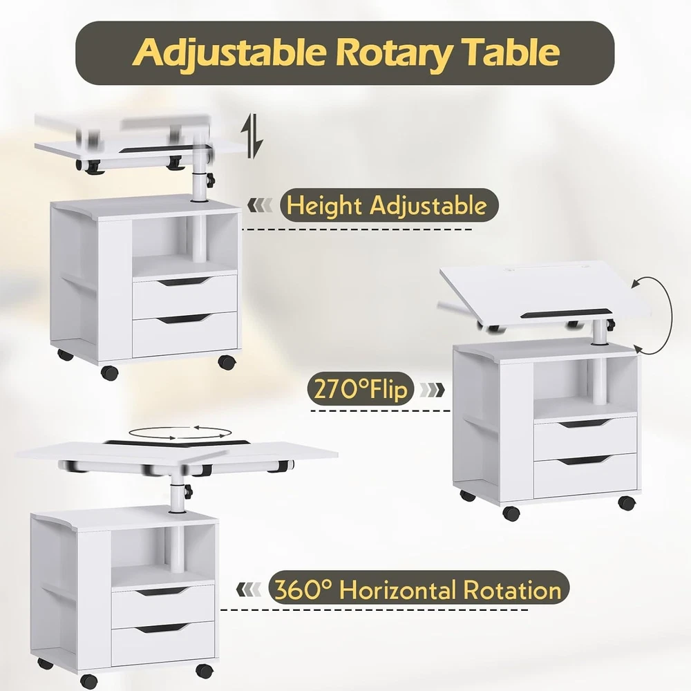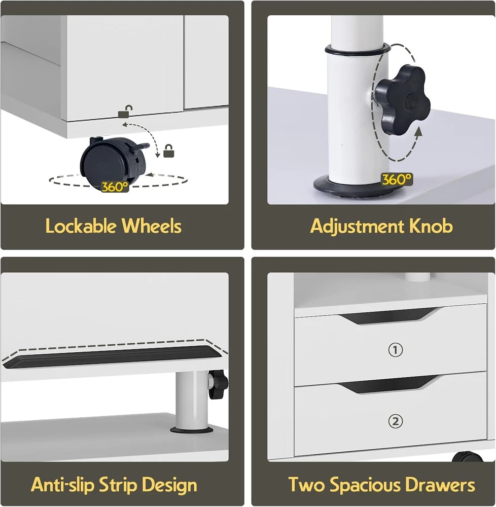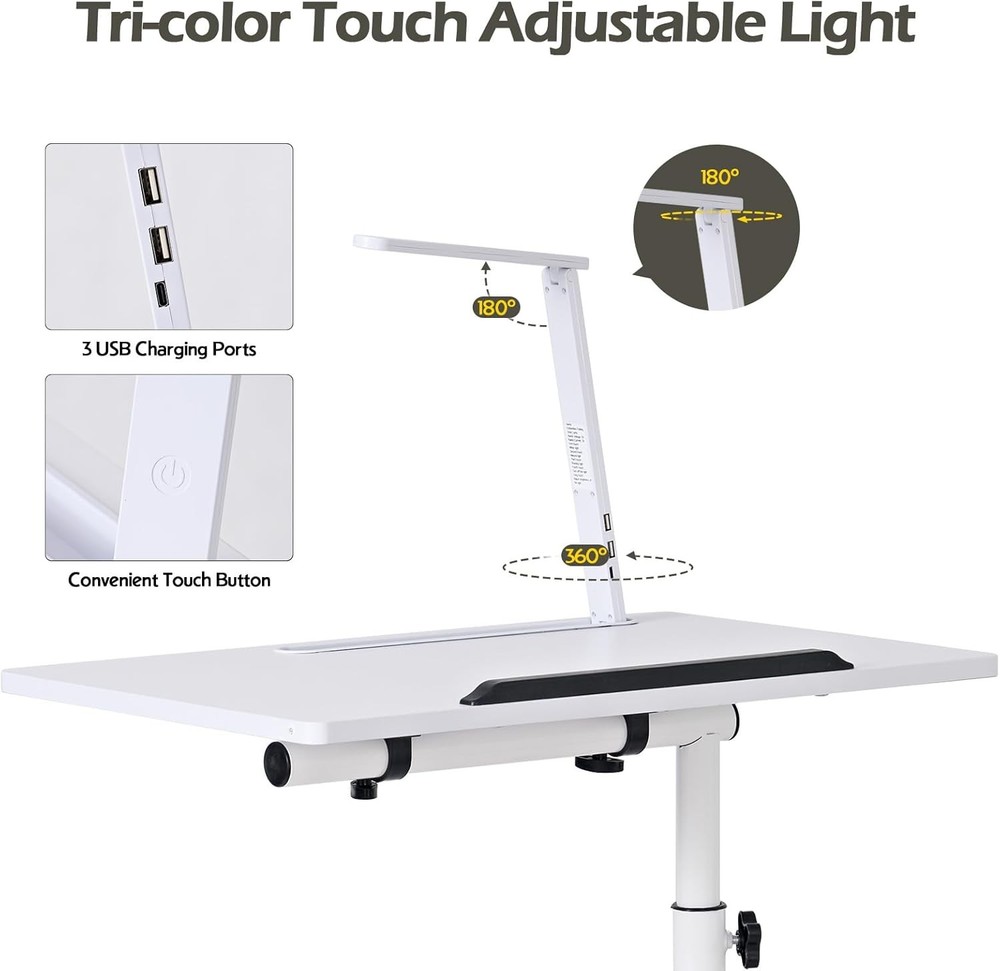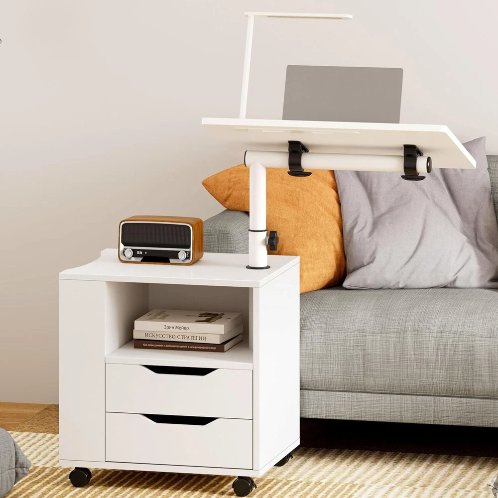 sogesfurniture Nightstand with Drawers and LED Lights, Bedside White-upgrade Product Details Brand: sogesfurniture Product Dimensions: 15.74"D x 18.11"W x 19.68"H Maximum Weight Recommendation: 110 Pounds Color: White-upgrade Table design: Nightstand Item WeightFrame Material: 20 KilogramsMetal Top Material TypeShape: Engineered WoodRectangular Nightstand with Lights: We designed this bedside table with Bluetooth controlled light strip with 1 remote control, featuring 16 light colors, 4 modes, 10 levels of brightness, suitable for all kinds of occasions, creating the perfect ambiance for reading, working or resting. No need for separate lamps to clutter your space. LED Lamp with 3 Charging Ports: Our smart nightstand comes with a foldable and 360°rotating desk lamp, which can easily turn on/off/switch the light by touching the button, providing 3 brightness choices, you can adjust it according to your needs, when it's not in use, it can be easily folded and stored into a fixed slot. Plus, the lamp is designed with 3 charging ports, 2 USB ports + 1 Type C, to meet the charging needs of different devices such as laptop, iPad, mobile phone, headphones. After the lamp is fully charged, it can be used independently. Effortless Mobility with Wheels: The addition of wheels makes this nightstand incredibly mobile. Move it easily from room to room or roll it over your bed as a convenient over-bed table. The wheels of the bedside table can be locked to maintain stability when needed. Adjustable Height & Angle for Your Convenience: With the knob on the stand, you can easily adjust the height and angle of the table top over the nightstand. Whether you use it as a side table next to the bed, sofa, or as a workstation for reading, watching videos, or for your daily work, the height and angle adjustments ensure that it's always at the perfect level. The tabletop is equipped with a slot to keep book or electronic devices firmly in place on the surface. High-quality Material: This multifunctional nightstand is made of premium MDF board and thickened metal frame, the tabletop is waterproof and scratch-resistant and provides excellent load-bearing capacity, maximum load capacity- Cabinet: 110 lbs, Top swivel top: 22 lbs, Drawers: 11 lbs; Overall dimensions: 23.6L * 15.7W * 27.5-35.4H inch. Ample Storage Space: Comes with 2 drawers, 1 open storage compartment and 1 side storage compartment for organizing different kinds of daily items with ease, this nightstand combines style with functionality, making it a perfect bedside companion and a perfect addition to any living room, bedroom, study and office.