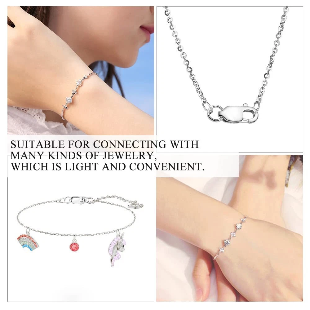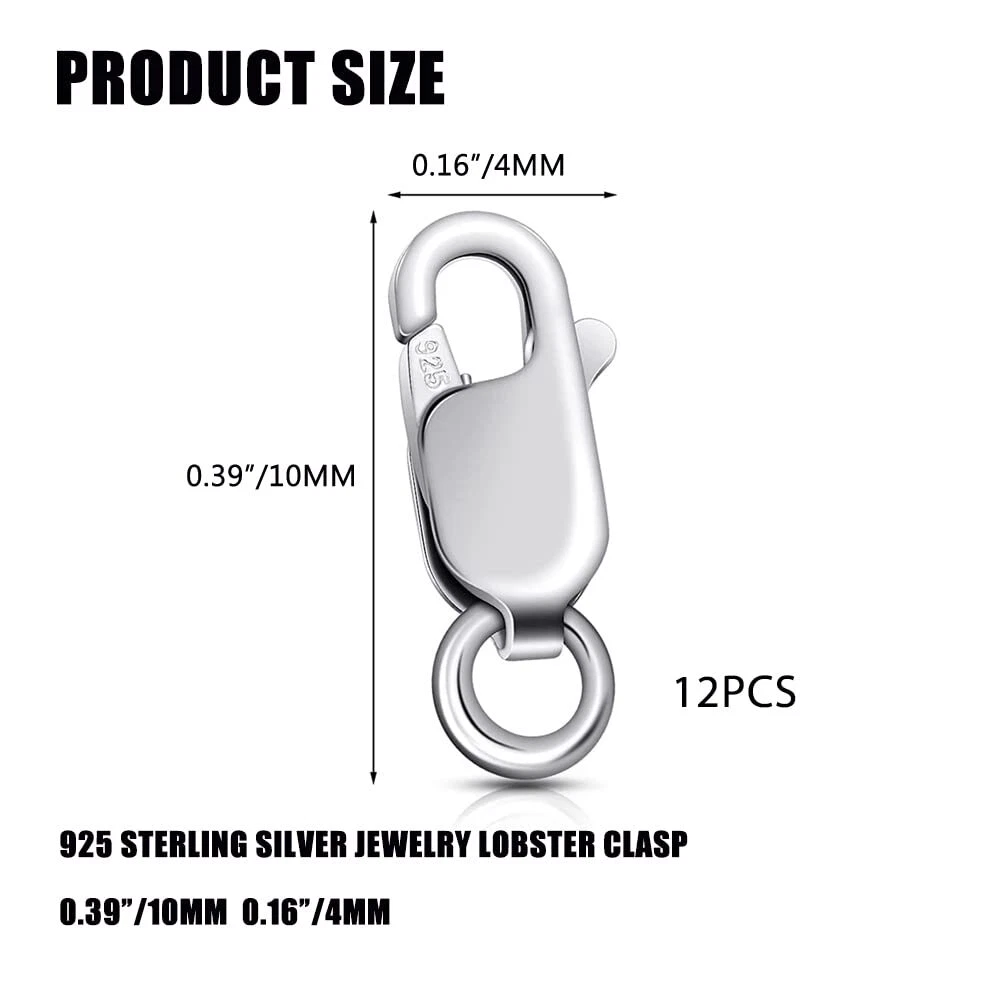 This solid metal self-closing lobster clasp with jump ring provides the perfect finishing touch to a variety of projects including bracelets, necklaces and other jewelry work Named for its claws that look like lobsters, the lobster clasp is one of the strongest clasps out there, with a simple design and bold dimensions. You can use it to complete necklaces or chunky bracelet designs for safety. Set of 12 925 Sterling Silver Lobster Claw Clasps with 2 Jump Rings, Designed for Jewelry Making, Compatible with Most Necklaces and Other Styles of Accessories, Perfect for Your Replacement Needs. Details: Color: Silver Material: 925 sterling silver Size:0.39” x 0.16” PACKAGE INCLUDED: 925 Sterling Silver Lobster Claw Clasp*12 PCS Use Notes: The lobster clasp set is not only good for repairing broken bracelets, but also has the added use of securing necklaces when a ring is missing, it can make your necklaces and bracelets whole again, helping you make charming necklaces for DIY fun with your family. Notes: Please allow chromatic aberration due to different lights and screens. Manual measurement, please allow slight errors on size. Package Contents: Set of 12 925 Sterling Silver Lobster Claw Clasps with 2 Jump Rings, Designed for Jewelry Making, Compatible with Most Necklaces and Other Styles of Accessories, Perfect for Your Replacement Needs. Product Features: Named for its claws that look like lobsters, the lobster clasp is one of the strongest clasps out there, with a simple design and bold dimensions. You can use it to complete necklaces or chunky bracelet designs for safety. Premium Material: Made of 925 sterling silver for durability. Silver plated with a highly polished glossy smooth finish that feels great to the touch. Helps prevent silver from tarnishing, rounded edges to avoid scratching wrists and comfortable to wear. Easy to Use: The lobster clasp set is not only good for repairing broken bracelets, but also has the added use of securing necklaces when a ring is missing, it can make your necklaces and bracelets whole again, helping you make charming necklaces for DIY fun with your family. After-sales Service Guarantee: This solid metal self-closing lobster clasp with jump ring provides the perfect finishing touch to a variety of projects including bracelets, necklaces and other jewelry work. Please contact us if any problem with our product, we will provide a satisfactory solution within 24h!