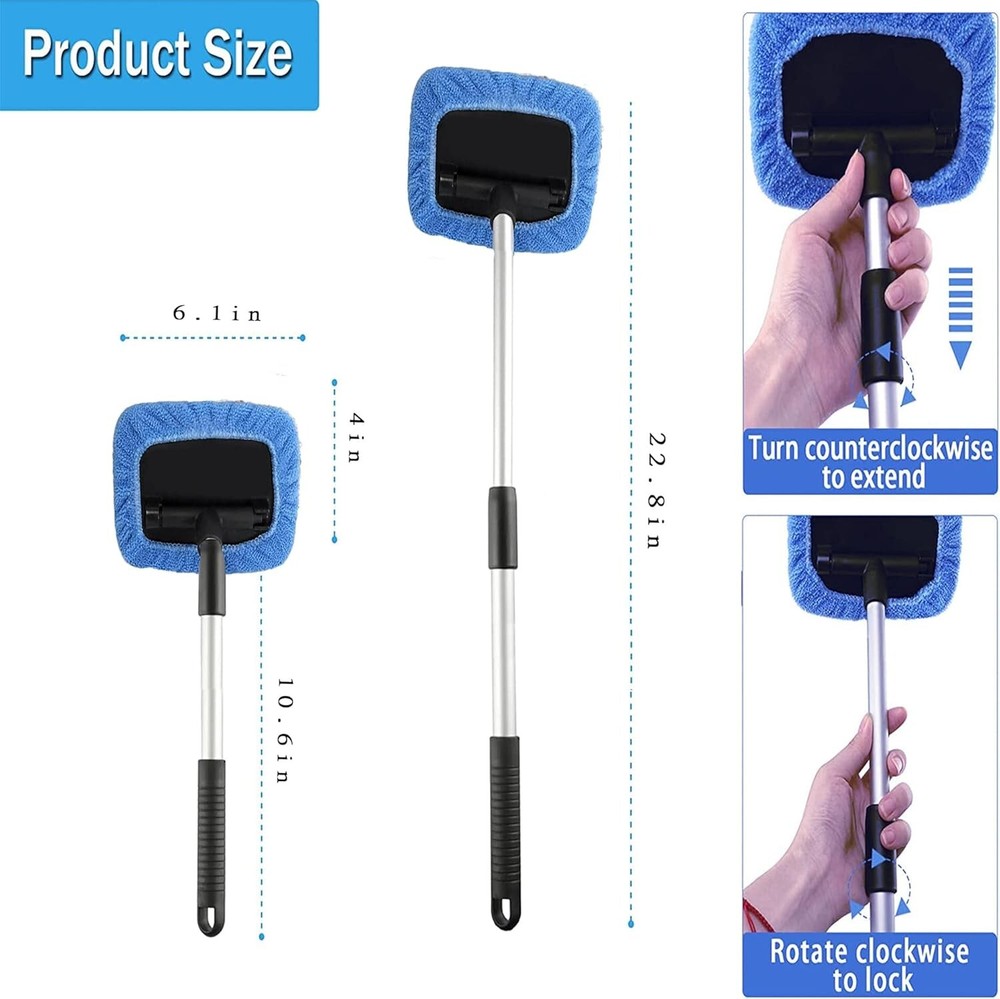 tCar Windshield Cleaning Tool inside Window Cleaner Defogger Brush Kit Microf... Color: Square Set FAST & EASY TO USE: The windshield cleaner tool is designed with extendable handle and pivoting head, makes easily clean car window interiors and exteriors without straining your back. Extendable car washer kit is ideal for most cars, SUV. INNOVATIVELY DESIGN: The handle of auto windshield cleaner is ergonomically designed which is anti-slip, comfortable to use, securely locks in place and can be extended from 14.6 in to 22.8 in, perfect for the bottom of car windows and the hard to reach area. 180°Swiveled Square Head: Designed with pivoting Square head to make a complete contact to the glass, which can be rotated 180 degrees to fit the glass surface very well, easy to clean the bottom of car windows or some hard-to-reach areas, easy to use and effortless.