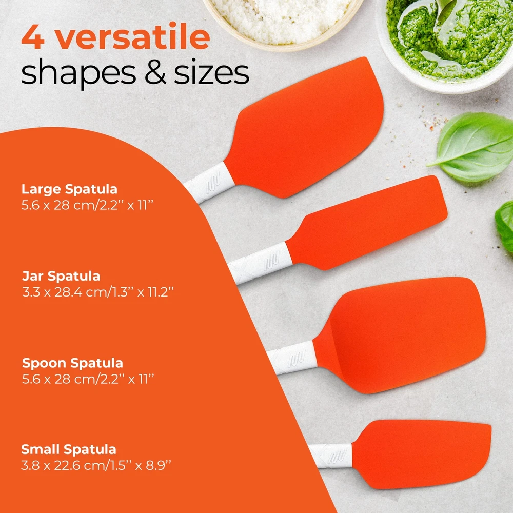 Picture this: The simple task of cooking an egg. You have your new, shiny non-stick pan with a little oil; you break the egg and listen to that lovely sizzle. But then, PANIC! Your nylon spatula has been sat on the side of too many pans and now the handle has started to melt and fall off. Even worse, the edges are so deformed by the heat that they stick to anything, making it impossible to even separate a couple of frying eggs, or flip a pancake. You turn to your old wooden spatula, but when it comes out of the dishwasher you see that it has a horrible coating and feels slimy to the touch. The solution? The Silicone Spatulas, of course! ✔they don’t stick, melt or deform in the heat. ✔they are BPA free, safe to use on non-stick pans. ✔they don’t stain or retain odors. ✔they won't discolor, warp or chip. ✔they are also dishwasher safe. These kitchen gadgets are carefully designed and created to make every kitchen professional, yet fun and fashionably colorful. The highly versatile spatulas can be used as a scraper spatula, icing spatula, baking spatula, jar spatula, and even as a mixing spoon. Looking at the above scenario and qualities of the Silicone Spatula Set, there is no doubt you will get your money's worth when you consider purchasing your spatulas set for use in your kitchen. To see just how much these kitchen utensils could make your life easier and your kitchen more colorful, ORDER YOURS NOW! And why not add these great baking supplies to your gift or wedding registry?As a bakeware set it would always make for the perfect gift! offers 100% RISK FREE No-Questions Asked Lifetime Free Replacement for your new set of heat resistant Silicone Spatulas! HEAT RESISTANT - Turn up the heat in your kitchen! This rubber spatula set can withstand up to 480 degrees Fahrenheit. No melting, no warping, no worries! SMOOTH BLADES - The bendable heads on our silicone kitchen utensils are gentle on cookware, leaving them unmarked and unscratched. Perfect for precise designs when frosting cake or scraping out the nooks of a peanut butter jar. COMFORTABLE GRIP - The easy to hold handles have a long and narrow neck for better maneuvering. This kitchen spatula set provides a textured grip that prevents slippage when wet. LIGHTWEIGHT & STRONG - These ergonomically designed spatulas for nonstick cookware are high quality, lightweight, and sturdy for flipping pancakes, making scrambled eggs, cleaning out a mayonnaise jar, mixing dough or cookie batter. VARIETY PACK - Our silicone cooking utensils set includes a large and small spatula, a spoonula, and a jar scraper. Versatile enough for use in frying pans, mixing bowls, sauce pots, cans, bottles, and more.