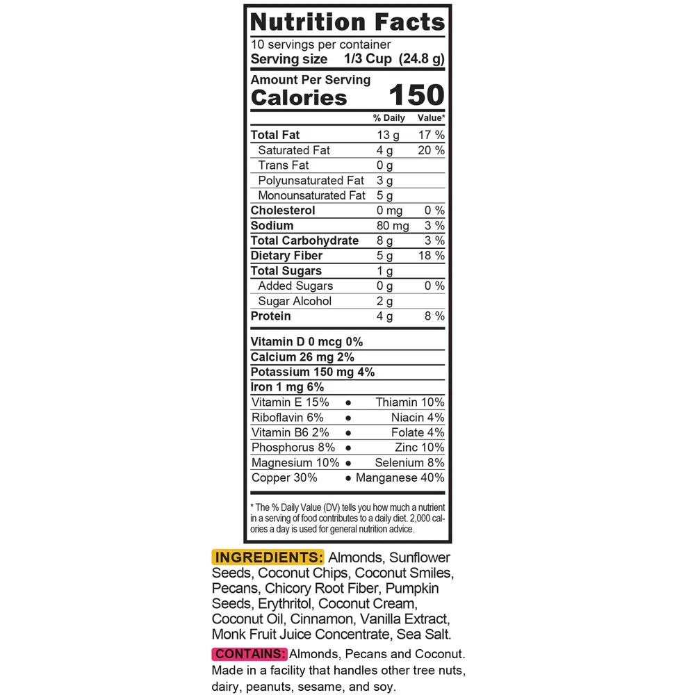 We're nuts about granola, and our keto nut granola is packed with fiber, protein, healthy fats, vitamins and minerals. It has absolutely no sugar added, and is only 1g Net Carb making it one of the lowest carb options out there for ketogenic dieters. You will love this! Sugar? No Thanks!: Our treats won't spike your sugar intake, with barely any sugar per serving. Enjoy guilt-free snacks again! Keto-Friendly & Low-Carb Delight: Enjoy our delicious products without the carbs, excess sugar, artificial flavors or preservatives. Free From Junk: Our products are gluten-free, grain-free, dairy-free, and keto-friendly, offering a wholesome snack choice for all. Good Source of Fiber: Packed with fiber to keep you feeling full and your digestion feeling good. No more cravings! Nutrient-Rich Ingredients: Loaded with protein, vitamins, and minerals from nutrient-dense nuts. Yum! Not today, GMOs!: Made with 100% non-GMO ingredients to ensure the highest quality and safety for you. Low Sodium: Our snacks are low in sodium, helping you maintain a healthy and active lifestyle. Sustainably Sourced: Our ingredients are ethically and sustainably sourced, supporting environmental conservation. Plant-Based: Completely plant-based and vegetarian-friendly, perfect for those following a natural foods diet. High in Antioxidants: Rich in antioxidants to help fight free radicals and support overall health and wellness.